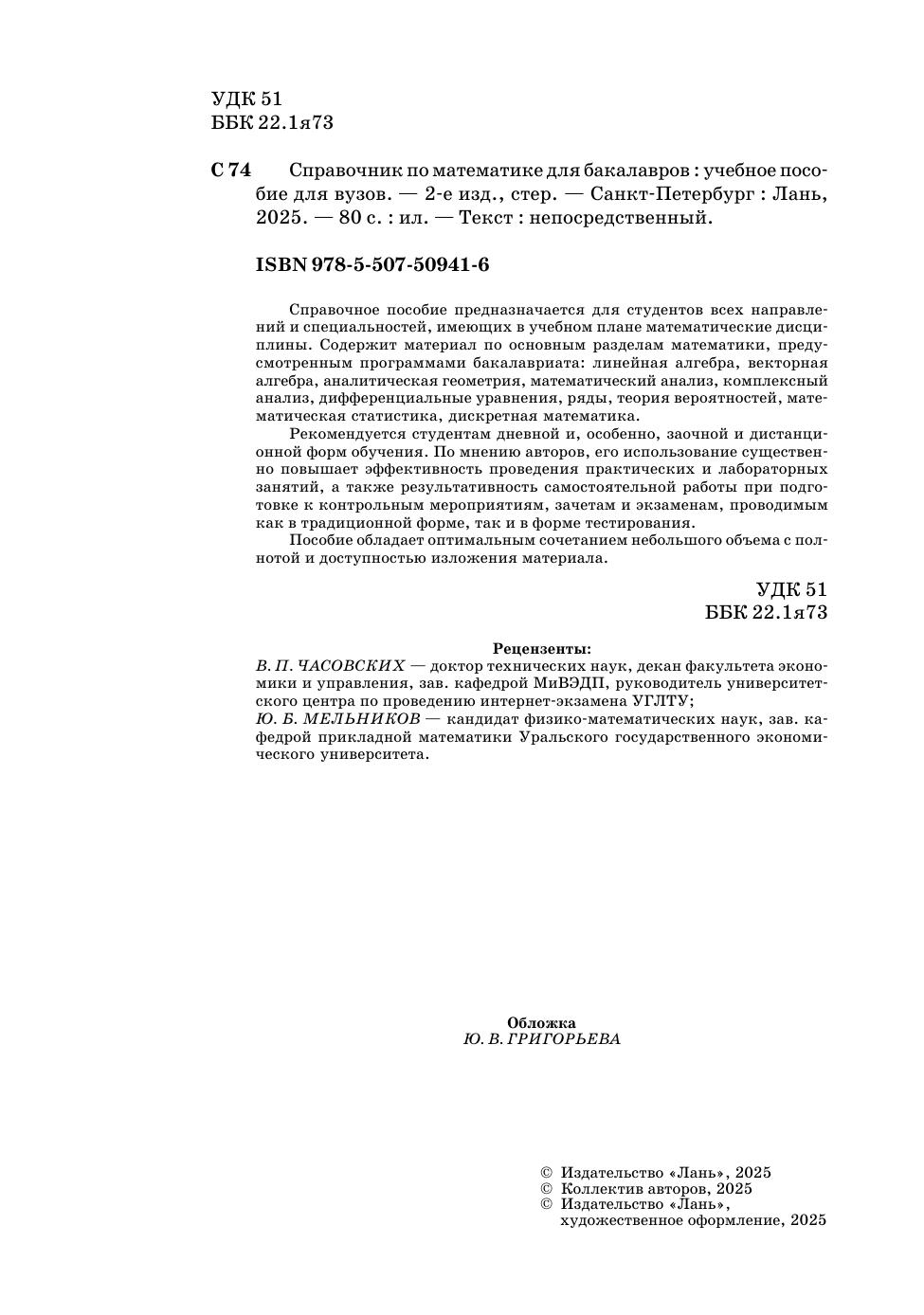Справочное пособие предназначается для студентов всех направлений и специальностей, имеющих в учебном плане математические дисциплины. Содержит материал по основным разделам математики, предусмотренными программами бакалавриата: линейная алгебра, векторная алгебра, аналитическая геометрия, математический анализ, комплексный анализ, дифференциальные уравнения, ряды, теория вероятностей, математическая статистика, дискретная математика. Рекомендуется студентам дневной и, особенно, заочной и дистанционной форм обучения. По мнению авторов, его использование существенно повышает эффективность проведения практических и лабораторных занятий, а также результативность самостоятельной работы при подготовке к контрольным мероприятиям, зачетам и экзаменам, проводимым как в традиционной форме, так и в форме тестирования. Пособие обладает оптимальным сочетанием небольшого объема с полнотой и доступностью изложения материала.