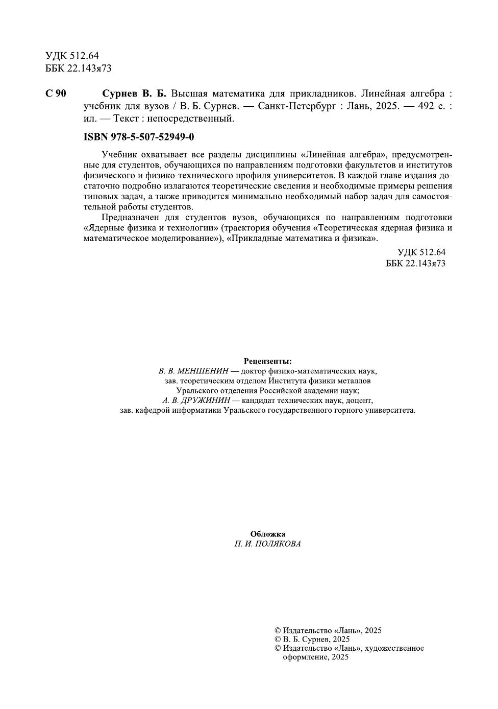 Учебник охватывает все разделы дисциплины «Линейная алгебра», предусмотренные для студентов, обучающихся по направлениям подготовки факультетов и институтов физического и физико-технического профиля университетов. В каждой главе издания достаточно подробно излагаются теоретические сведения и необходимые примеры решения типовых задач, а также приводится минимально необходимый набор задач для самостоятельной работы студентов. Предназначен для студентов вузов, обучающихся по направлениям подготовки «Ядерные физика и технологии» (траектория обучения «Теоретическая ядерная физика и математическое моделирование»), «Прикладные математика и физика».