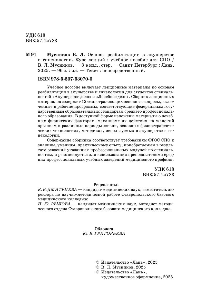 Учебное пособие включает лекционные материалы по основам реабилитации в акушерстве и гинекологии для студентов специальностей «Акушерское дело» и «Лечебное дело». Сборник лекционных материалов содержит 12 тем, отражающих основные вопросы, включенные в рабочие программы, соответствующие Федеральным государственным образовательным стандартам среднего профессионального образования. В доступной форме изложены материалы о лечебных физических факторах, механизме их действия на женский организм в различные периоды жизни, основных физиотерапевтических технологиях, методиках, используемых в акушерстве и гинекологии. Содержание сборника соответствует требованиям ФГОС СПО к знаниям, умениям, практическому опыту, приобретаемым в результате освоения указанных профессиональных модулей по специальностям, и рекомендуется для использования преподавателями средних профессиональных учебных заведений медицинского профиля.