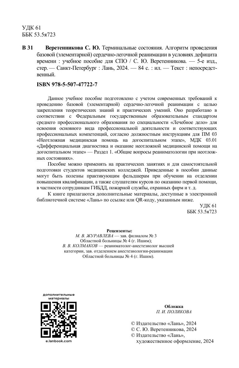 Данное учебное пособие подготовлено с учетом современных требований к проведению базовой (элементарной) сердечно-легочной реанимации с целью закрепления теоретических знаний и практических умений. Оно разработано в соответствии с Федеральным государственным образовательным стандартом среднего профессионального образования по специальности «Лечебное дело» для освоения основного вида профессиональной деятельности и соответствующих профессиональных компетенций, согласно должностным инструкциям для ПМ 03 «Неотложная медицинская помощь на догоспитальном этапе», МДК 03.01 «Дифференциальная диагностика и оказание неотложной медицинской помощи на догоспитальном этапе» — Раздел 1. «Общие вопросы реаниматологии при неотложных состояниях». Пособие можно применять на практических занятиях и для самостоятельной подготовки студентов медицинских колледжей. Приведенные в пособии данные могут быть полезны практикующим фельдшерам при обучении на отделении повышения квалификации, а также слушателям курсов по оказанию первой помощи, в частности сотрудникам ГИБДД, пожарной службы, охранных фирм и т. д. К книге прилагаются дополнительные материалы, доступные в электронной библиотечной системе «Лань» по ссылке или QR-коду, указанным ниже.