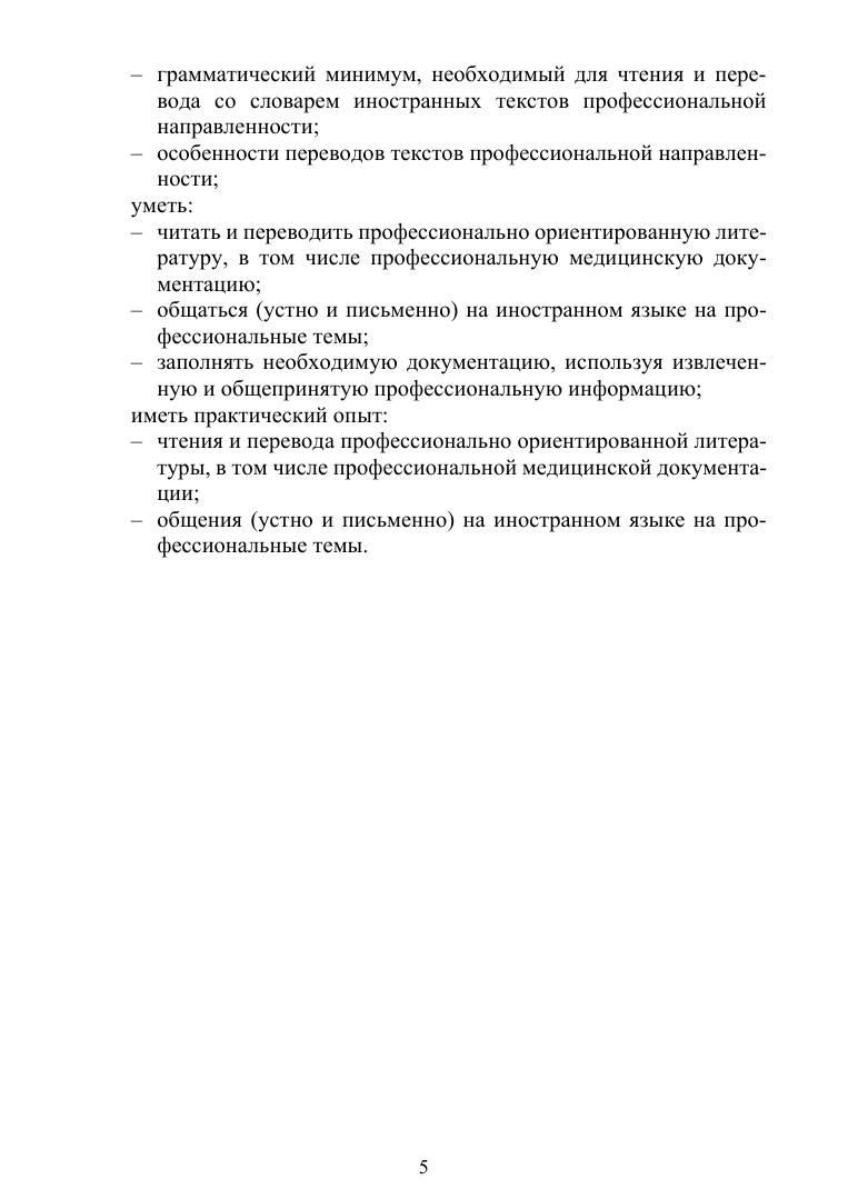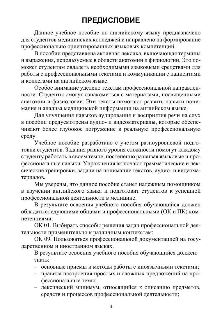 Учебное пособие предназначено для развития профессиональных коммуникативных навыков в медицинской сфере. Включает активную лексику, соответствующую медицинской терминологии, и обеспечивает студентов необходимыми языковыми инструментами для эффективного общения с коллегами и пациентами на английском языке. Пособие дополнено аудио- и видеоматериалами, способствующими развитию навыков аудирования, произношения и активного использования языка в профессиональных ситуациях. Соответствует современным требованиям Федерального государственного образовательного стандарта среднего профессионального образования и профессиональным квалификационным требованиям.