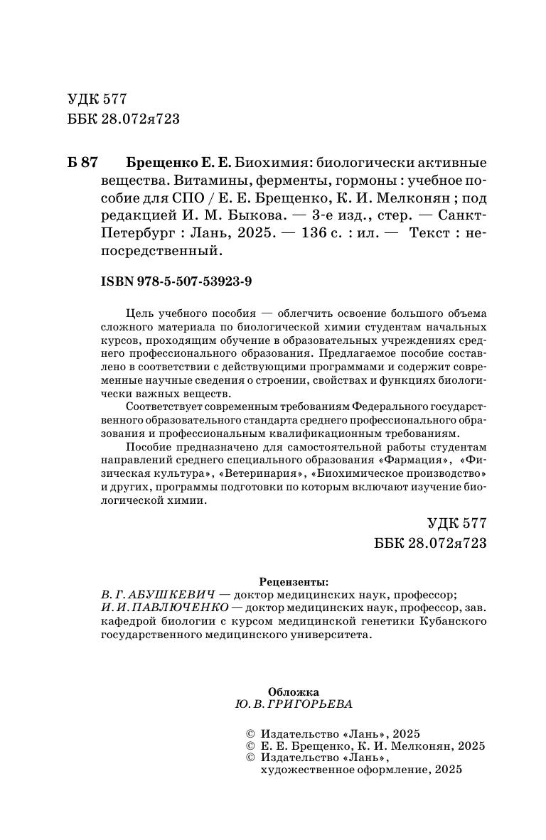 Цель учебного пособия — облегчить освоение большого объема сложного материала по биологической химии студентам начальных курсов, проходящим обучение в образовательных учреждениях среднего профессионального образования. Предлагаемое пособие составлено в соответствии с действующими программами и содержит современные научные сведения о строении, свойствах и функциях биологически важных веществ. Соответствует современным требованиям Федерального государственного образовательного стандарта среднего профессионального образования и профессиональным квалификационным требованиям. Пособие предназначено для самостоятельной работы студентам направлений среднего специального образования «Фармация», «Физическая культура», «Ветеринария», «Биохимическое производство» и других, программы подготовки по которым включают изучение биологической химии.