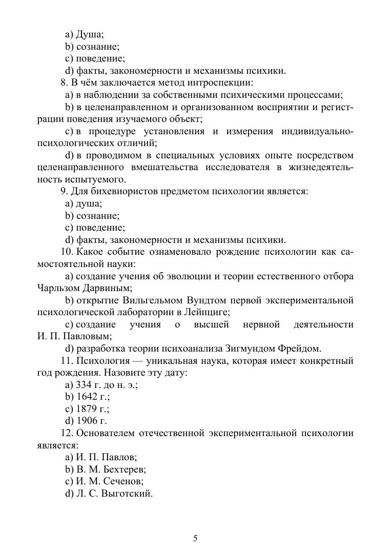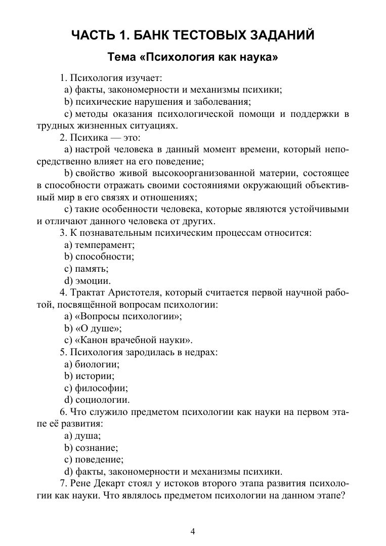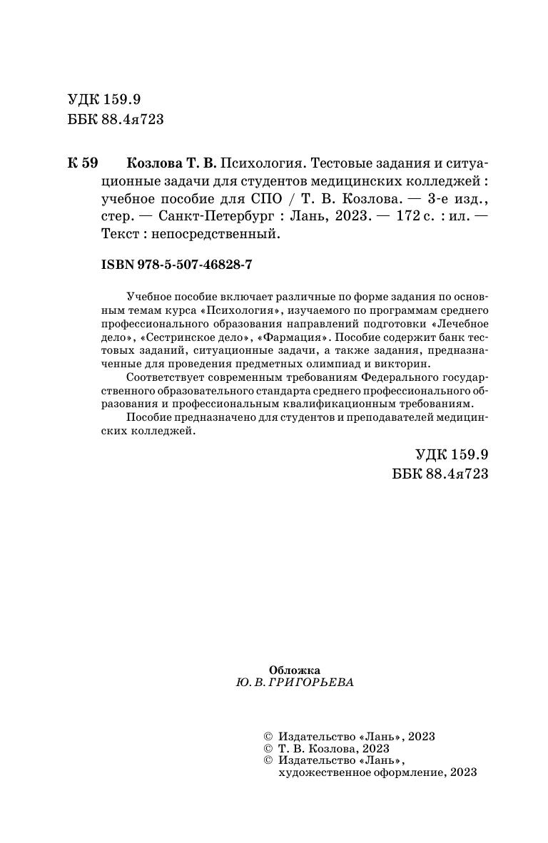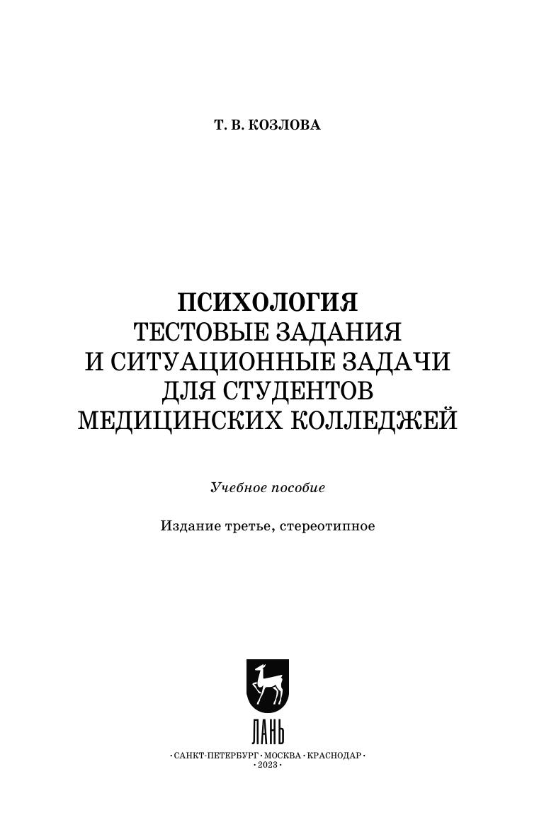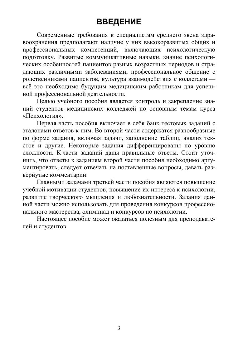 Учебное пособие включает различные по форме задания по основным темам курса «Психология», изучаемого по программам среднего профессионального образования направлений подготовки «Лечебное дело», «Сестринское дело», «Фармация». Пособие содержит банк тестовых заданий, ситуационные задачи, а также задания, предназначенные для проведения предметных олимпиад и викторин. Соответствует современным требованиям Федерального государственного образовательного стандарта среднего профессионального образования и профессиональным квалификационным требованиям. Пособие предназначено для студентов и преподавателей медицинских колледжей.