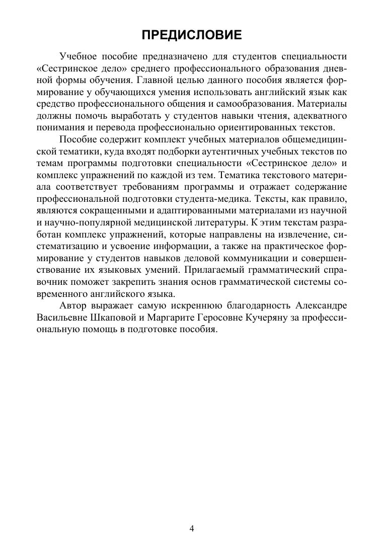 Пособие содержит комплект учебных материалов общемедицинской тематики, куда входят подборки аутентичных учебных текстов и комплекс упражнений по каждой из тем. Упражнения направлены на извлечение, систематизацию и усвоение информации, а также на практическое формирование у студентов навыков деловой коммуникации и совершенствование их языковых умений. Грамматический справочник поможет закрепить знания основ грамматической системы современного английского языка. Соответствует современным требованиям Федерального государственного образовательного стандарта среднего профессионального образования и профессиональным квалификационным требованиям.