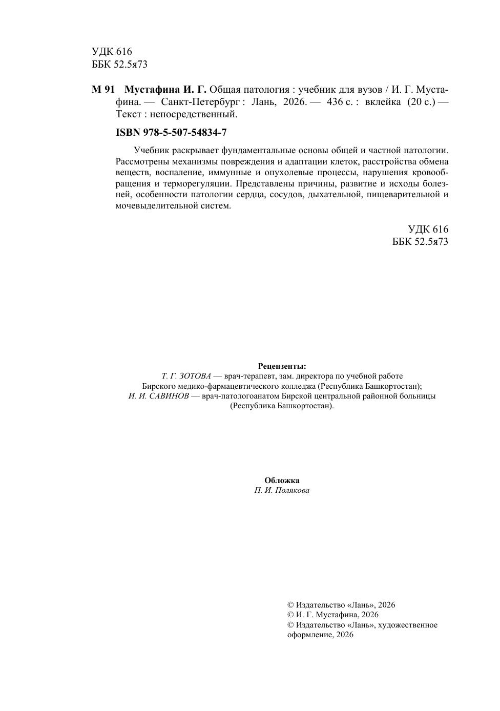 Учебник раскрывает фундаментальные основы общей и частной патологии. Рассмотрены механизмы повреждения и адаптации клеток, расстройства обмена веществ, воспаление, иммунные и опухолевые процессы, нарушения кровообращения и терморегуляции. Представлены причины, развитие и исходы болезней, особенности патологии сердца, сосудов, дыхательной, пищеварительной и мочевыделительной систем.