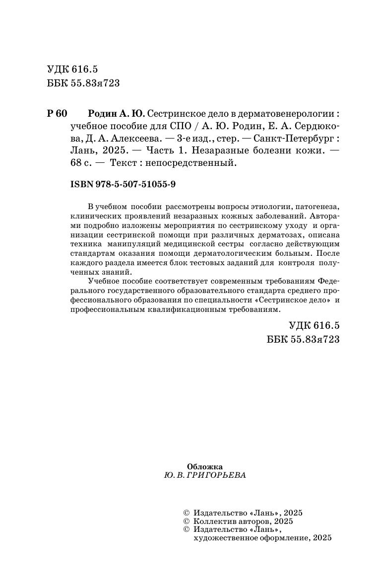 В учебном пособии рассмотрены вопросы этиологии, патогенеза, клинических проявлений незаразных кожных заболеваний. Авторами подробно изложены мероприятия по сестринскому уходу и организации сестринской помощи при различных дерматозах, описана техника манипуляций медицинской сестры согласно действующим стандартам оказания помощи дерматологическим больным. После каждого раздела имеется блок тестовых заданий для контроля полученных знаний. Учебное пособие соответствует современным требованиям Федерального государственного образовательного стандарта среднего профессионального образования по специальности «Сестринское дело» и профессиональным квалификационным требованиям.