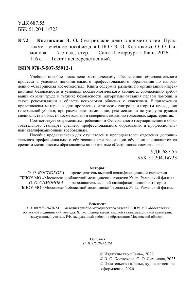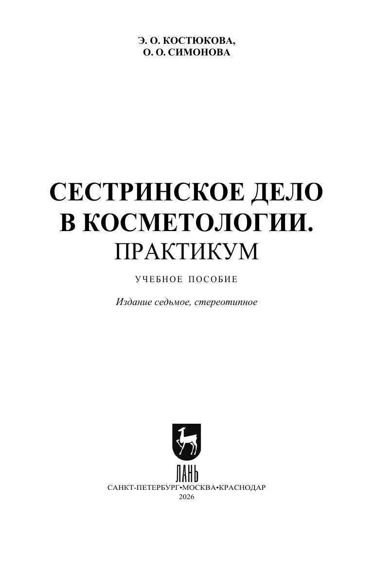 Учебное пособие посвящено методическому обеспечению образовательного процесса в условиях дополнительного профессионального образования по направлению «Сестринская косметология». Книга содержит разделы по организации инфекционной безопасности в условиях косметологического кабинета, соблюдению требований охраны труда и технике безопасности, алгоритмы оказания первой помощи, а также рекомендации в области психологии общения с клиентами. В приложении представлены материалы для проведения итогового контроля, алгоритм проведения генеральной уборки, и программа деконтаминации, рекомендации по уходу за руками специалиста в области косметологии и совершенствованию голосовых характеристик. Соответствует современным требованиям Федерального государственного образовательного стандарта среднего профессионального образования и профессиональным квалификационным требованиям. Пособие предназначено для слушателей и преподавателей отделения дополнительного профессионального образования при реализации обучения специалистов со средним медицинским образованием по программе «Сестринская косметология».