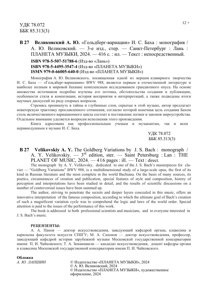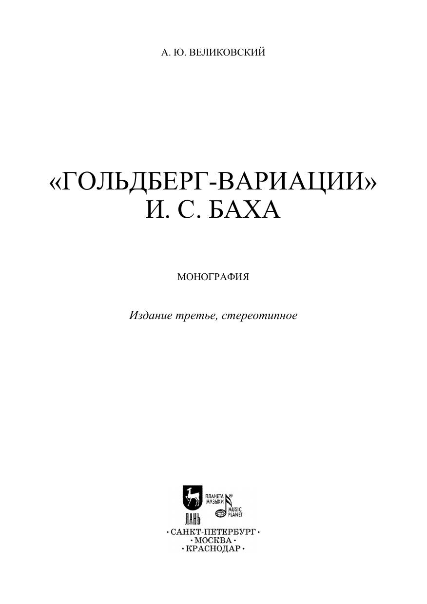 Монография А. Ю. Великовского, посвященная одной из вершин клавирного творчества И. С. Баха — «Гольдберг-вариациям» BWV 988, является первым в отечественной литературе и наиболее полным в мировой бахиане комплексным исследованием грандиозного опуса. На основе множества источников подробно изучены его поэтика, обстоятельства создания и публикации, особенности стиля и композиции, история восприятия и интерпретаций, а также подведены итоги научных дискуссий по ряду спорных вопросов. Стремясь проникнуть в тайны и глубинные слои, скрытые в этой музыке, автор предлагает новаторскую трактовку прославленного сочинения, согласно которой конечная цель создания Бахом столь величественного вариационного цикла состоит в постижении логики и законов ми¬роустройства. Отдельное внимание уделяется вопросам исполнения этого произведения. Книга адресована как профессиональным ученым и музыкантам, так и всем, неравнодушным к музыке И. С. Баха. The monograph by A. Y. Velikovsky, dedicated to one of the J. S. Bach's masterpieces for clavier – "Goldberg Variations" BWV 988, is a multidimensional study of a large-scale opus, the first of its kind in Russian literature and the most complete in the world Bachiana. On the basis of many sources, its poetics, circumstances of creation and publication, special features of style and composition, history of perception and interpretations have been studied in detail, and the results of scientific discussions on a number of controversial issues have been summed up. The author, striving to penetrate the secrets and deeper layers concealed in this music, offers an innovative interpretation of the famous composition, according to which the ultimate goal of Bach's creation of such a magnificent variation cycle was to comprehend the logic and laws of the world order. Special attention is paid to the issues of the performance of this work. The book is addressed to both professional scientists and musicians, and to everyone interested in J. S. Bach’s music.