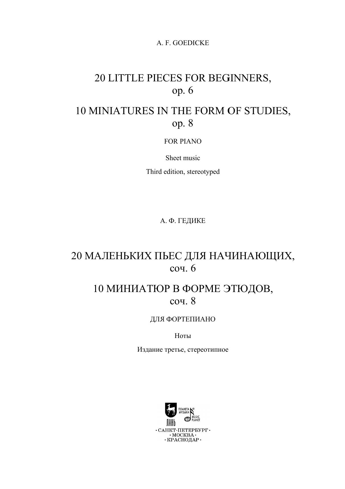 20 маленьких пьес для начинающих. Cоч. 6. 10 миниатюр в форме этюдов. Соч. 8. Для фортепиано