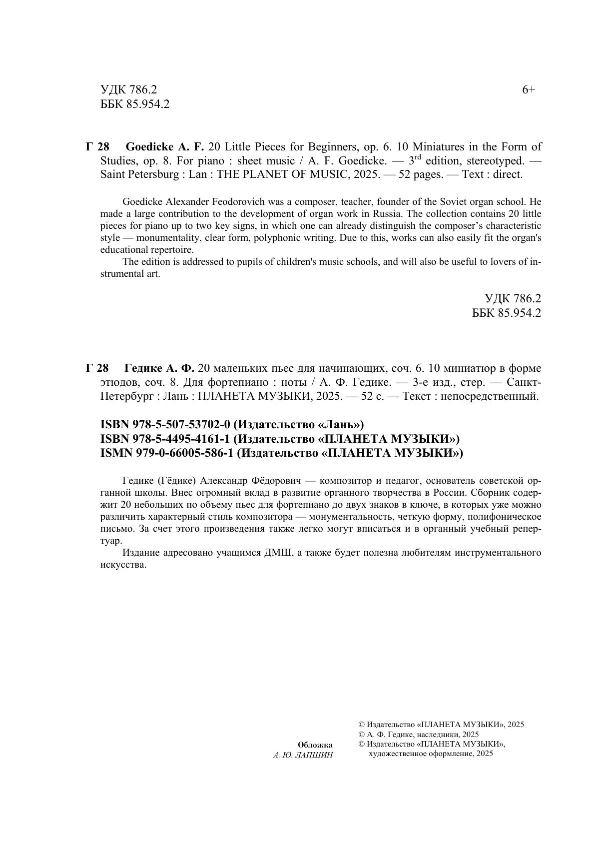 Гедике (Гёдике) Александр Фёдорович – композитор и педагог, основатель советской органной школы. Внес огромный вклад в развитие органного творчества в России. Сборник содержит 20 небольших по объему пьес для фортепиано до двух знаков в ключе, в которых уже можно различить характерный стиль композитора – монументальность, четкую форму, полифоническое письмо. За счет этого произведения также легко могут вписаться и в органный учебный репертуар. Издание адресовано учащимся ДМШ, а также будет полезна любителям инструментального искусства.