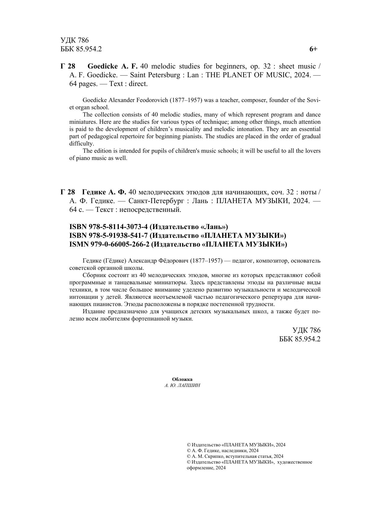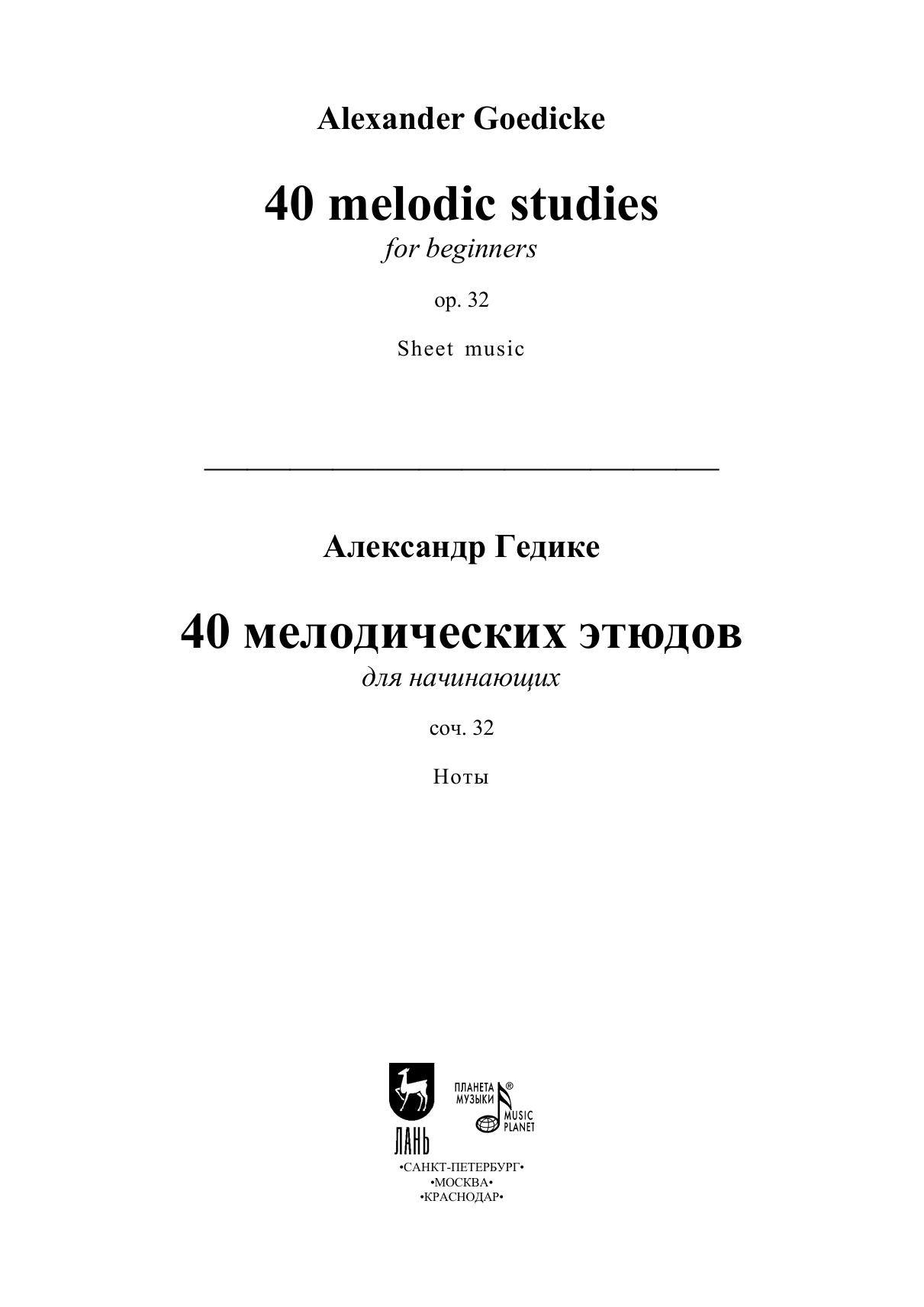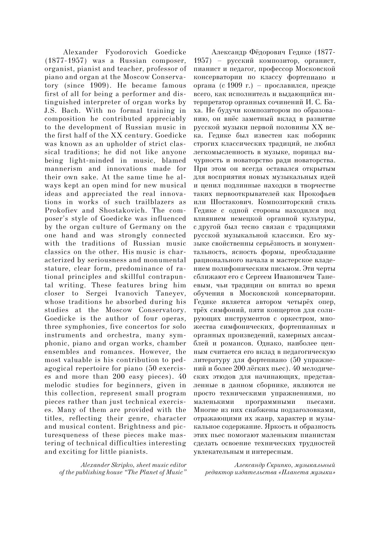Гедике, Гёдике Александр Федорович,1877 – 1957 – педагог, композитор, основатель советской органной школы. Сборник состоит из 40 мелодических этюдов, многие из которых представляют собой программные и танцевальные миниатюры. Здесь представлены этюды на различные виды техники, в том числе большое внимание уделено развитию музыкальности и мелодической интонации у детей. Являются неотъемлемой частью педагогического репертуара для начинающих пианистов. Этюды расположены в порядке постепенной трудности. Издание предназначено для учащихся детских музыкальных школ, а также будет полезно всем любителям фортепианного творчества.