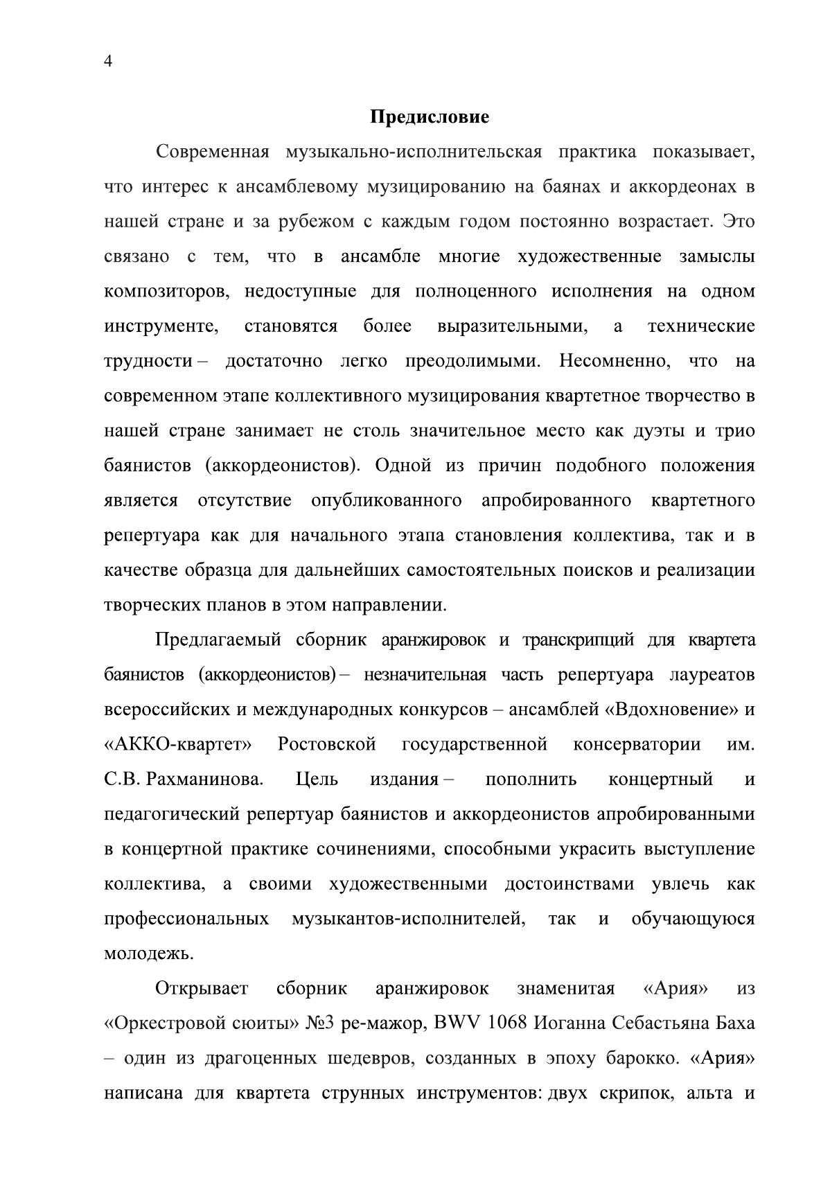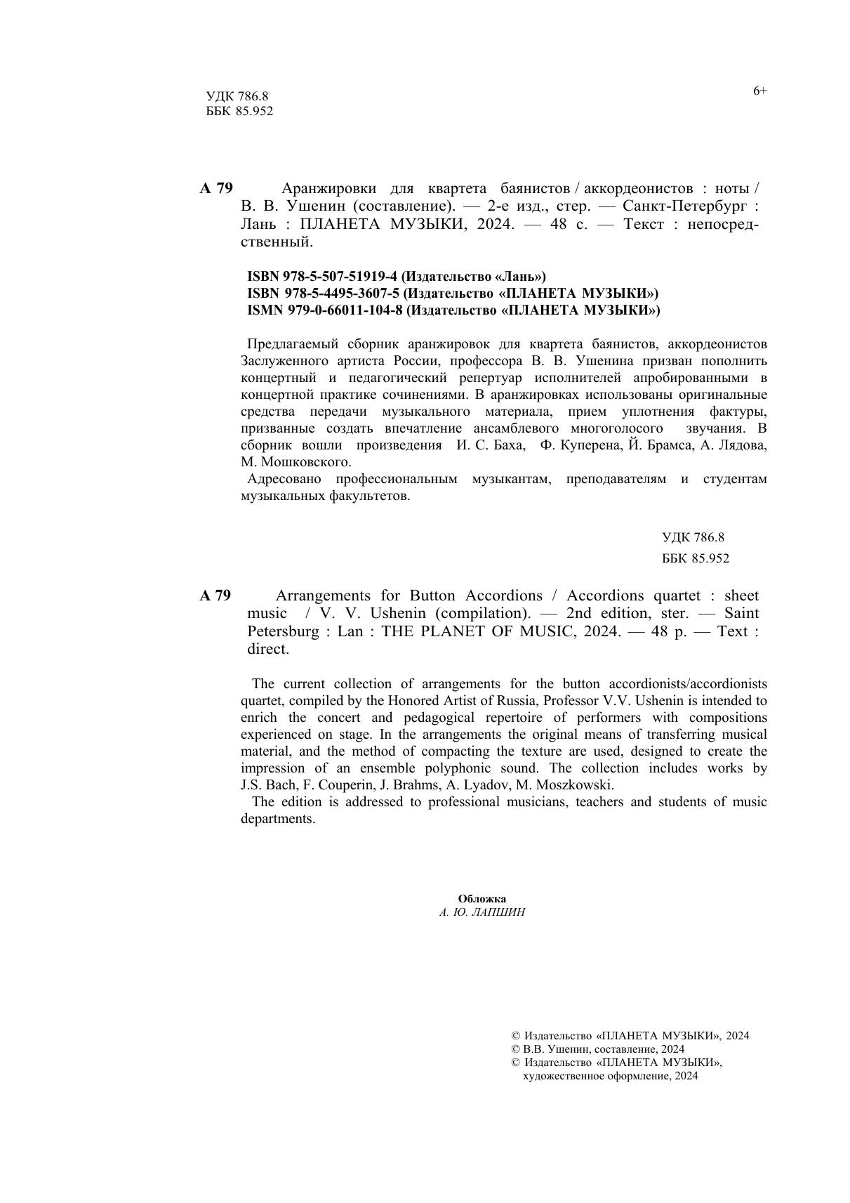 Предлагаемый сборник аранжировок для квартета баянистов, аккордеонистов Заслуженного артиста России, профессора В.В. Ушенина призван пополнить концертный и педагогический репертуар исполнителей апробированными в концертной практике сочинениями. В аранжировках использованы оригинальные средства передачи музыкального материала, прием уплотнения фактуры, призванные создать впечатление ансамблевого многоголосого звучания. В сборник вошли произведения И.С. Баха, Ф. Куперена, Й. Брамса, А. Лядова, М. Мошковского. Адресовано профессиональным музыкантам, преподавателям и студентам музыкальных факультетов. The current collection of arrangements for the button accordionists/accordionists quartet, compiled by the Honored Artist of Russia, Professor V.V. Ushenin is intended to enrich the concert and pedagogical repertoire of performers with compositions experienced on stage. In the arrangements the original means of transferring musical material, and the method of compacting the texture are used, designed to create the impression of an ensemble polyphonic sound. The collection includes works by J.S. Bach, F. Couperin, J. Brahms, A. Lyadov, M. Moszkowski. The edition is addressed to professional musicians, teachers and students of music departments.