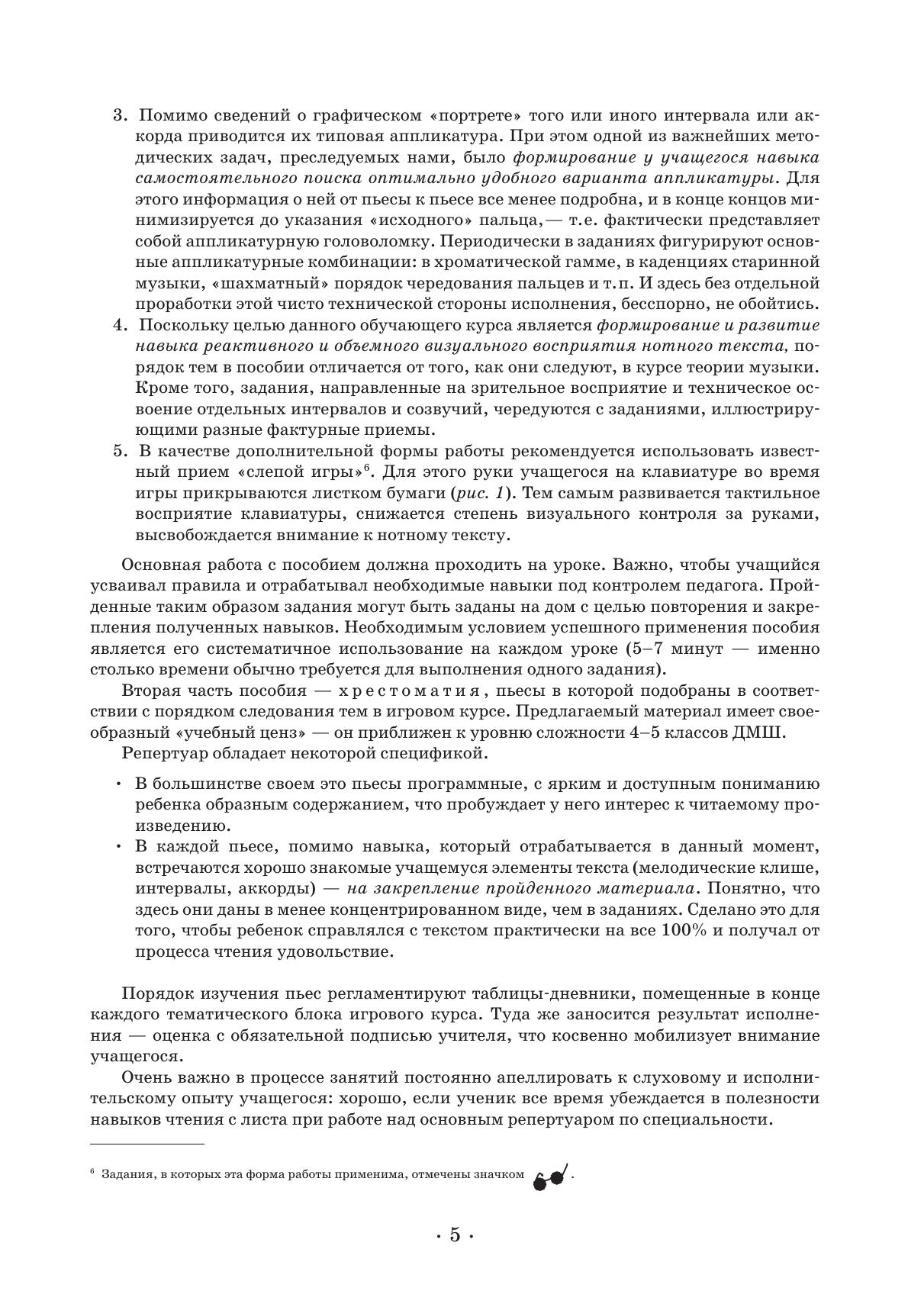 Данное пособие развивает способность быстро и синхронно считывать сразу несколько информационных слоев текста: нотный, ритмический, динамический и пр. Первая часть игрового курса состоит из заданий. Их порядок и расположение подчинены первоочередным задачам: снять психологический зажим у ребенка перед чтением нот с листа и сделать это занятие увлекательным. Вторая часть пособия – хрестоматия, пьесы в которой подобраны в соответствии с порядком следования тем в первой части.