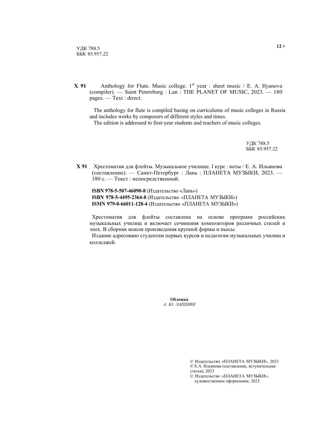 Хрестоматия для флейты составлена на основе программ российских музыкальных училищ и включает сочинения композиторов различных стилей и эпох. В сборник вошли произведения крупной формы и пьесы. Издание адресовано студентам первых курсов и педагогам музыкальных училищ и колледжей. The anthology for flute is compiled basing on curriculums of music colleges in Russia and includes works by composers of different styles and times. The edition is addressed to first-year students and teachers of music colleges.
