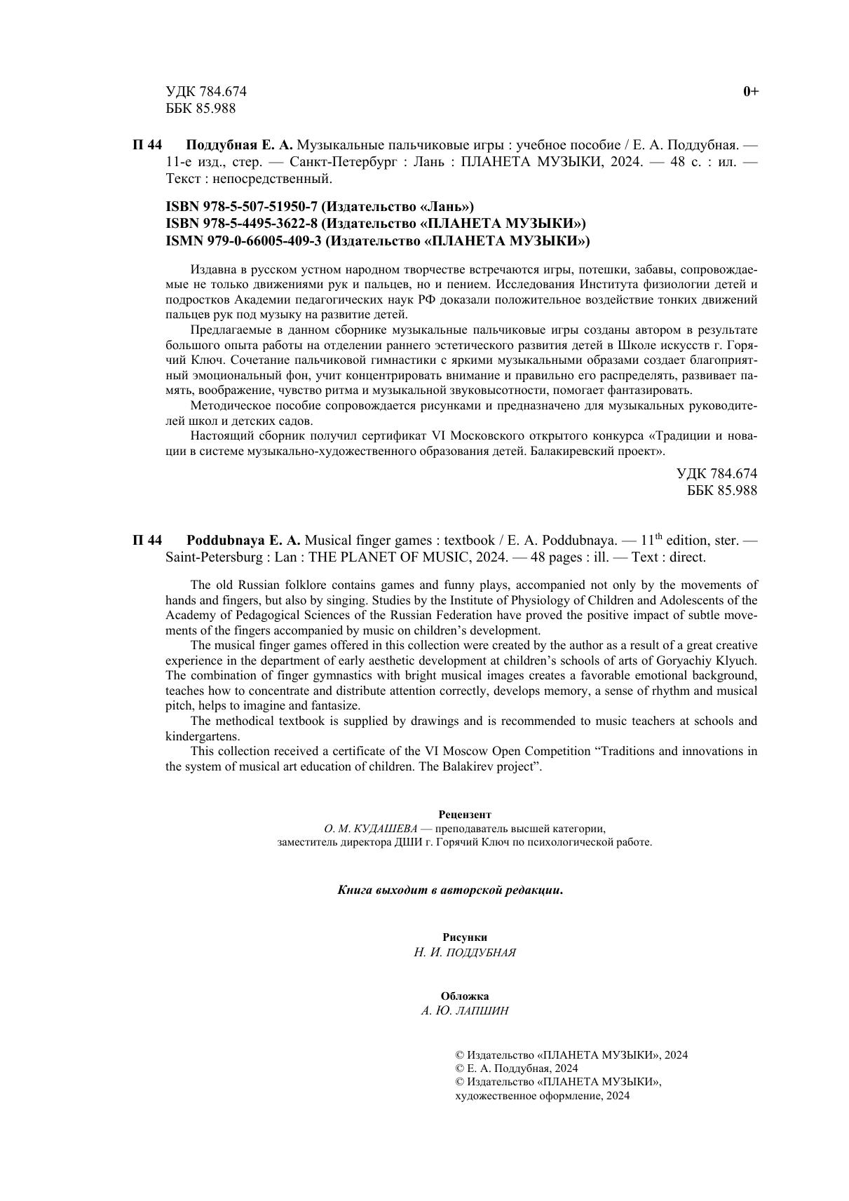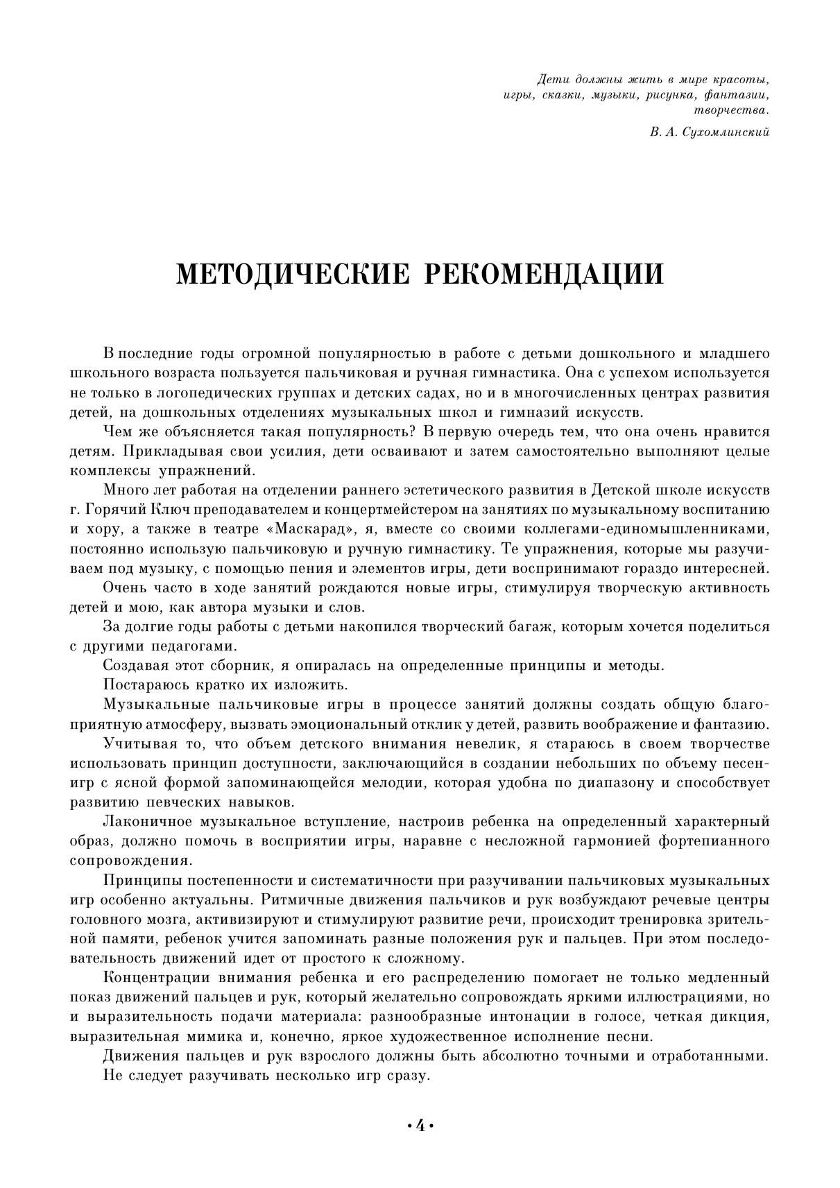 Издавна в русском устном народном творчестве встречаются игры, потешки, забавы, сопровождаемые не только движениями рук и пальцев, но и пением. Исследования Института физиологии детей и подростков Академии педагогических наук РФ доказали положительное воздействие тонких движений пальцев рук под музыку на развитие детей. Предлагаемые в данном сборнике музыкальные пальчиковые игры созданы автором в результате большого творческого опыта на отделении раннего эстетического развития детей в Школе искусств г. Горячий Ключ. Сочетание пальчиковой гимнастики с яркими музыкальными образами создает благоприятный эмоциональный фон, учит концентрировать внимание и правильно его распределять, развивает память, чувство ритма и музыкальной звуковысотности, помогает воображать и фантазировать. Настоящий сборник получил сертификат VI Московского открытого конкурса «Традиции и новации в системе музыкально-художественного образования детей. Балакиревский проект». Методическое пособие сопровождается рисунками и рекомендуется музыкальным руководителям школ и детских садов.