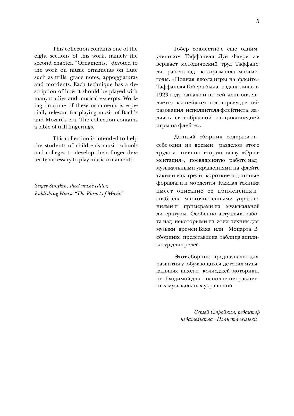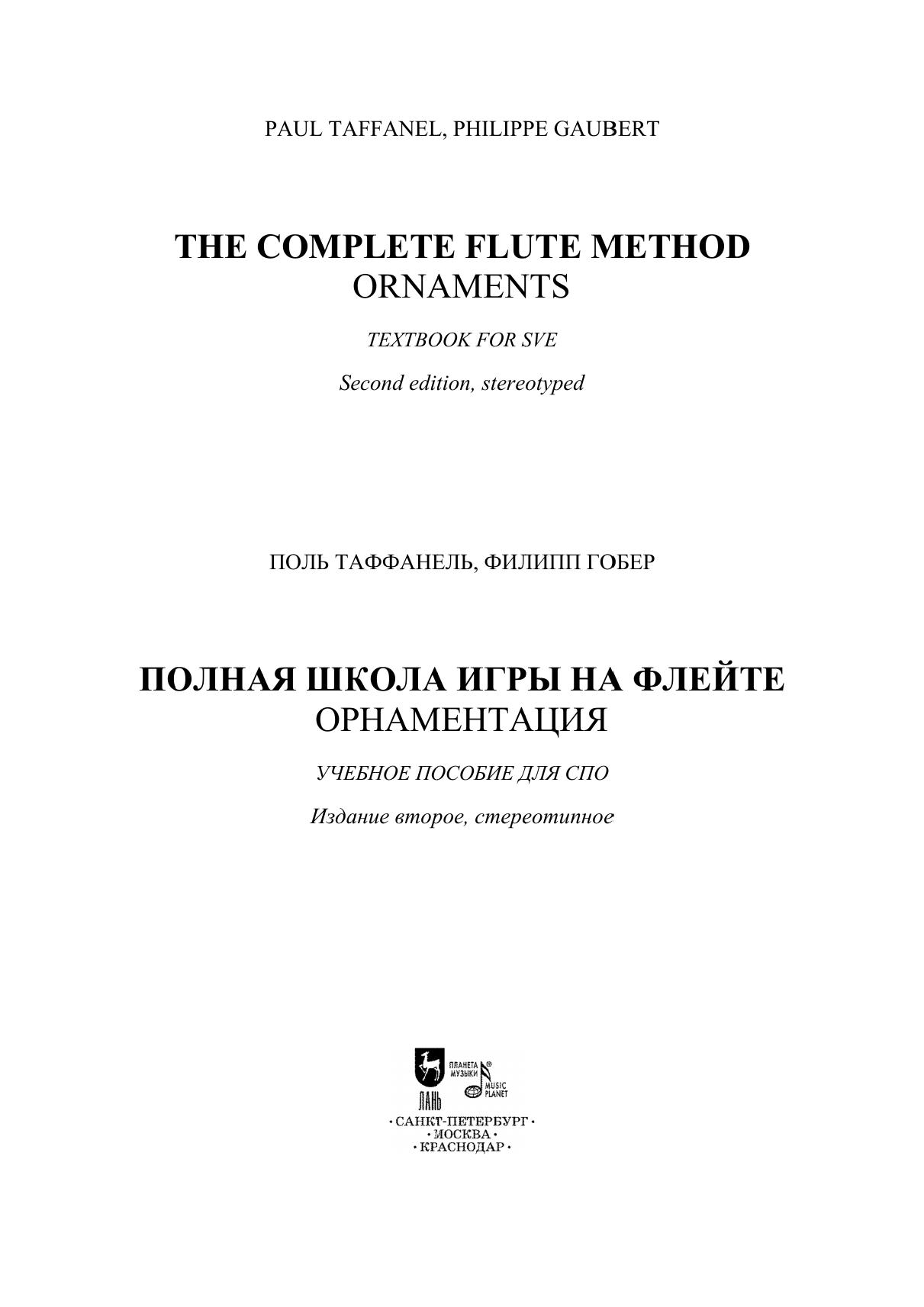 Поль Таффанель (1844–1908) — французский флейтист, композитор и педагог, воспитавший не одно поколение исполнителей. В соавторстве с учеником и последователем Филиппом Гобером (1879–1941) он создал учебное пособие «Полная школа игры на флейте», которое и по сей день является важнейшим подспорьем для образования исполнителя-флейтиста, являясь своеобразной «энциклопедией игры на флейте». Данный сборник содержит в себе один из восьми разделов этого труда, а именно вторую главу «Орнаментация», посвященную работе над музыкальными украшениями, такими как трели, короткие и длинные форшлаги и морденты. Каждая техника имеет описание и снабжена упражнениями и примерами из музыкальной литературы. В сборнике представлена таблица аппликатур для трелей. Соответствует современным требованиям Федерального государственного образовательного стандарта среднего профессионального образования и профессиональным квалификационным требованиям. Сборник предназначен для развития у студентов колледжей моторики, необходимой для исполнения различных музыкальных украшений. Paul Taffanel (1844–1908) was a French flutist, composer and teacher who educated more than one generation of performers. In collaboration with his student and follower Philippe Gaubert (1879–1941), he wrote the “Complete Flute Method” manual, which to this day is much helpful for the education of a flute player, being a kind of “encyclopedia of playing the flute”. This collection contains one of eight parts of this work, namely the second chapter “Ornamentation”, devoted to the work on music ornaments such as trills, grace notes, appoggiaturas and mordents. Each technique has a description of how it should be played with many studies and musical excerpts. The collection contains a table of trill fingerings. Corresponds to the modern requirements of the Federal State Educational Standard of Secondary Vocational Education and professional qualification requirements. The collection is intended to help the students of colleges