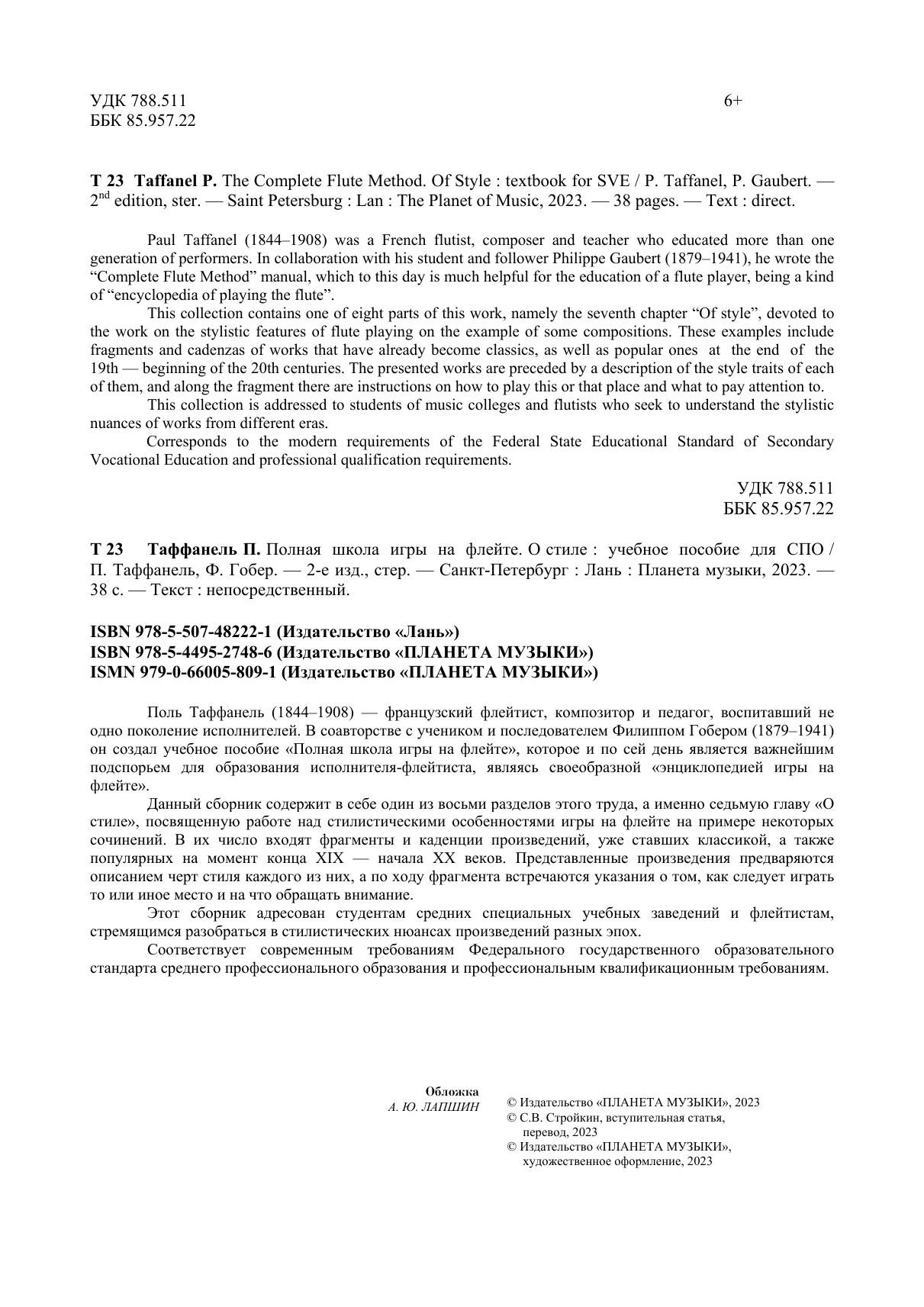 Поль Таффанель (1844–1908) — французский флейтист, композитор и педагог, воспитавший не одно поколение исполнителей. В соавторстве с учеником и последователем Филиппом Гобером (1879–1941) он создал учебное пособие «Полная школа игры на флейте», которое и по сей день является важнейшим подспорьем для образования исполнителя-флейтиста, являясь своеобразной «энциклопедией игры на флейте». Данный сборник содержит в себе один из восьми разделов этого труда, а именно седьмую главу «О стиле», посвященную работе над стилистическими особенностями игры на флейте на примере некоторых сочинений. В их число входят фрагменты и каденции произведений, уже ставших классикой, а также популярных на момент конца XIX – начала XX веков. Представленные произведения предваряются описанием черт стиля каждого из них, а по ходу фрагмента встречаются указания о том, как следует играть то или иное место и на что обращать внимание. Этот сборник адресован студентам средних специальных учебных заведений и флейтистам, стремящимся разобраться в стилистических нюансах произведений разных эпох. Paul Taffanel (1844–1908) was a French flutist, composer and teacher who educated more than one generation of performers. In collaboration with his student and follower Philippe Gaubert (1879–1941), he wrote the “Complete Flute Method” manual, which to this day is much helpful for the education of a flute player, being a kind of “encyclopedia of playing the flute”. This collection contains one of eight parts of this work, namely the seventh chapter “Of style”, devoted to the work on the stylistic features of flute playing on the example of some compositions. These examples include fragments and cadenzas of works that have already become classics, as well as popular ones at the end of the 19th – beginning of the 20th centuries. The presented works are preceded by a description of the style traits of each of them, and along the fragment there are instructions on how to play this or that place and what to pay attention to. This collection is addressed to students of music colleges and flutists, who seek to understand the stylistic nuances of works from different eras.