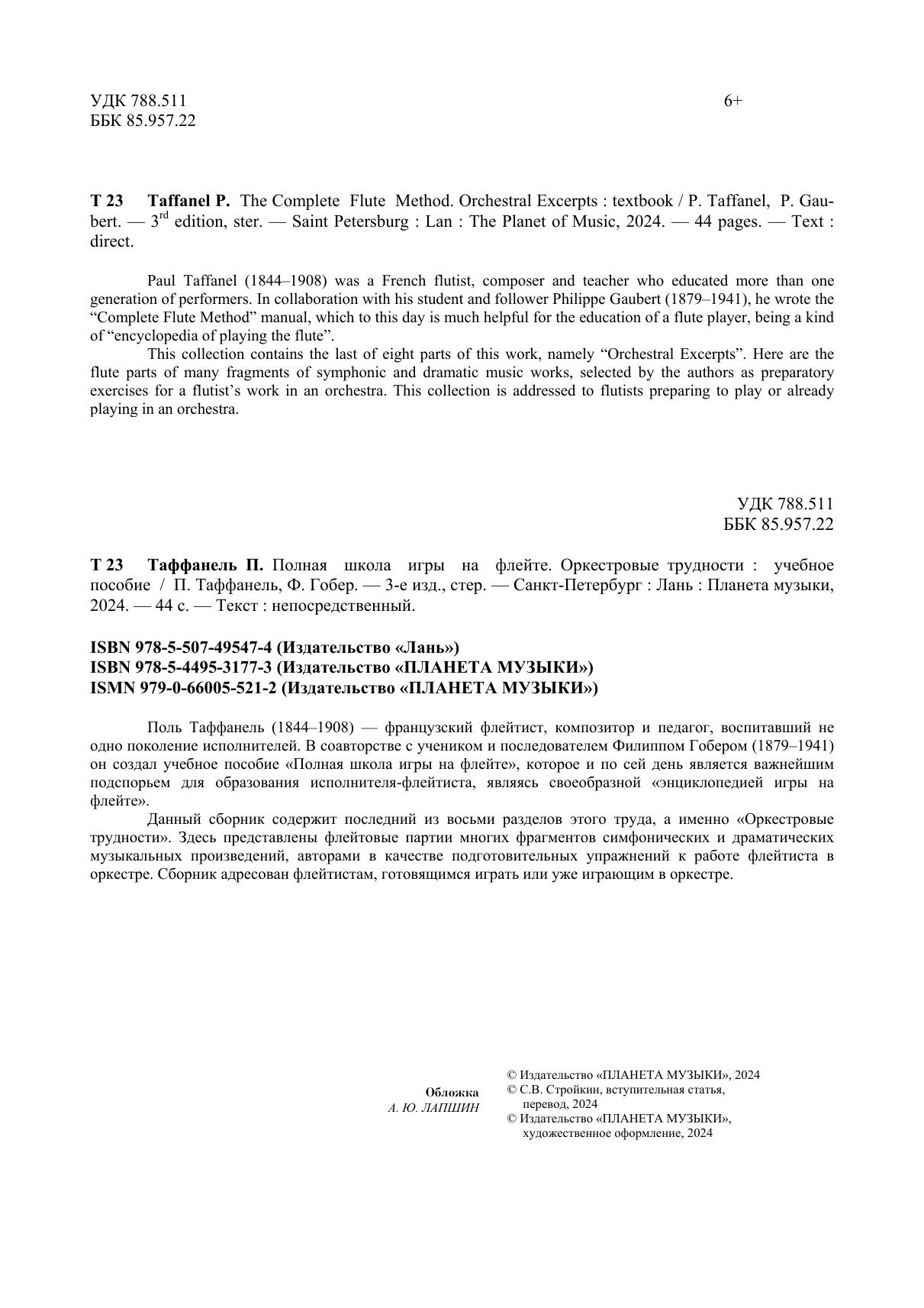 Поль Таффанель (1844–1908) — французский флейтист, композитор и педагог, воспитавший не одно поколение исполнителей. В соавторстве с учеником и последователем Филиппом Гобером (1879–1941) он создал учебное пособие «Полная школа игры на флейте», которое и по сей день является важнейшим подспорьем для образования исполнителя-флейтиста, являясь своеобразной «энциклопедией игры на флейте». Данный сборник содержит последний из восьми разделов этого труда, а именно «Оркестровые трудности». Здесь представлены флейтовые партии многих фрагментов симфонических и драматических музыкальных произведений, избранных авторами в качестве подготовительных упражнений к работе флейтиста в оркестре. Сборник адресован флейтистам, готовящимся играть или уже играющим в оркестре.