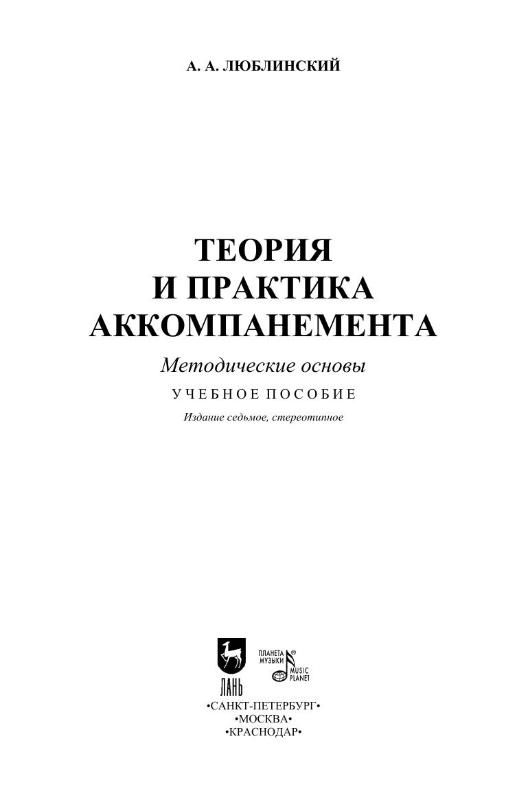 «Теория и практика аккомпанемента» впервые была издана в 1972 году. Автор, Александр Александрович Люблинский, чьи выдающиеся способности аккомпаниатора и по сей день помнят в Петербургской консерватории, обобщил в книге свой многолетний исключительный опыт работы с солистами-инструменталистами, певцами, хорами и т.д. Данный труд представляет собой глубокое исследование искусства аккомпанемента с позиции примата музыкального содержания, охватывающего три аспекта изучения: эстетические закономерности, анализ материала, проблемы исполнительства. Книга адресована концертмейстерам, пианистам и всем, кого живо интересует глубина и суть искусства аккомпанемента. "Theory and practice of accompaniment" was first published in 1972. The author, Alexander Alexandrovich Lyublinsky, whose outstanding accompanist skills are still remembered at the St. Petersburg Conservatory, summarized in the book his many years’ exceptional experience with soloists-instrumentalists, singers, choirs, etc. This work represents a deep study of the art of accompaniment from a standpoint of the primacy of musical content, encompassing three aspects of study: aesthetic patterns, material analysis, performance problems. The book is addressed to concertmasters, pianists and anyone who is keenly interested in the depth and essence of the art of accompaniment.