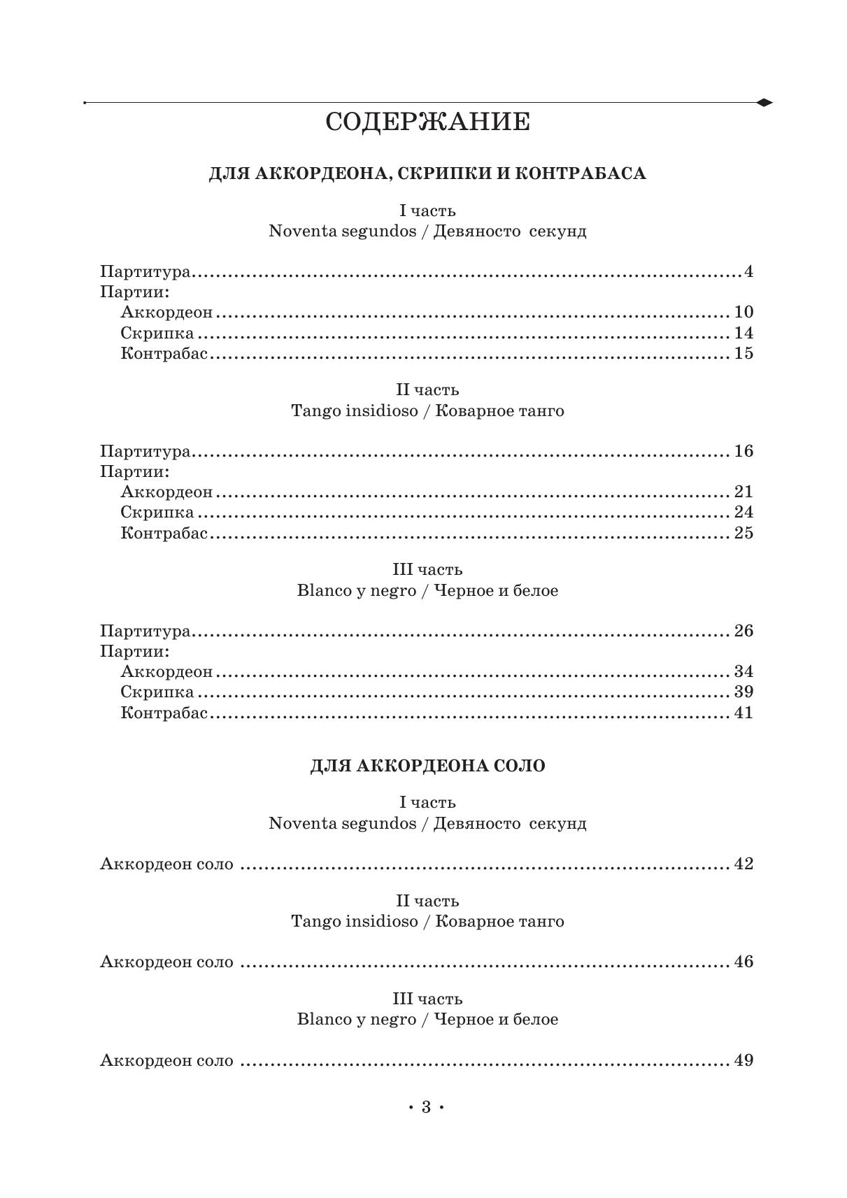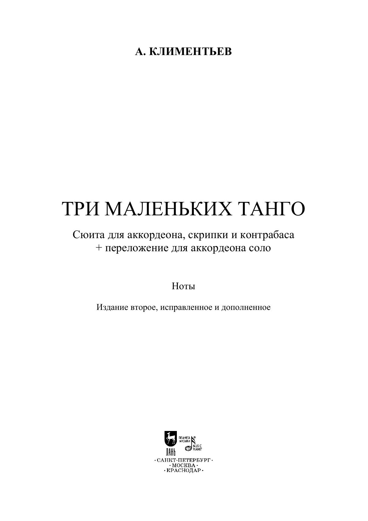 В настоящий сборник вошли три музыкальные истории в жанре Tango Nuevo петербургского композитора и музыканта Алексея Климентьева. Сюита написана для аккордеона, скрипки и контрабаса. В музыке переплетается джазовая импровизация, аргентинское танго и виртуозный стиль мюзетт. Издание содержит партитуру и партии отдельных инструментов, а также переложение для аккордеона соло. This collection includes three music stories in the Tango Nuevo style by Alexey Klimentyev, St. Petersburg-based composer and musician. The suite is written for accordion, violin and double bass. The music is the fusion of jazz improvisation, Argentine tango and the virtuoso musette style. The edition contains the score and instrumental parts, as well as the transcription for solo accordion.