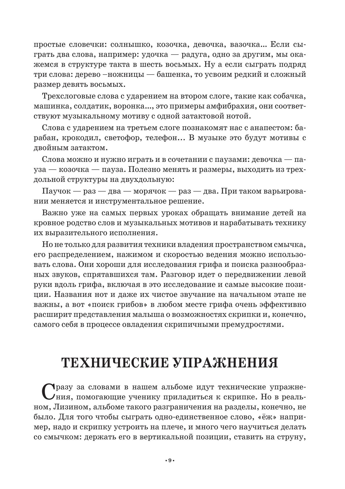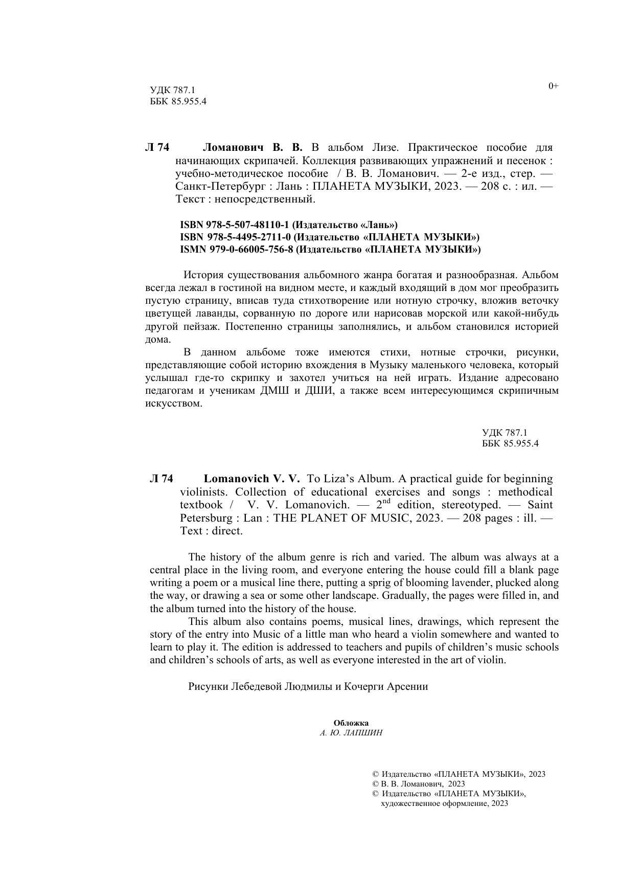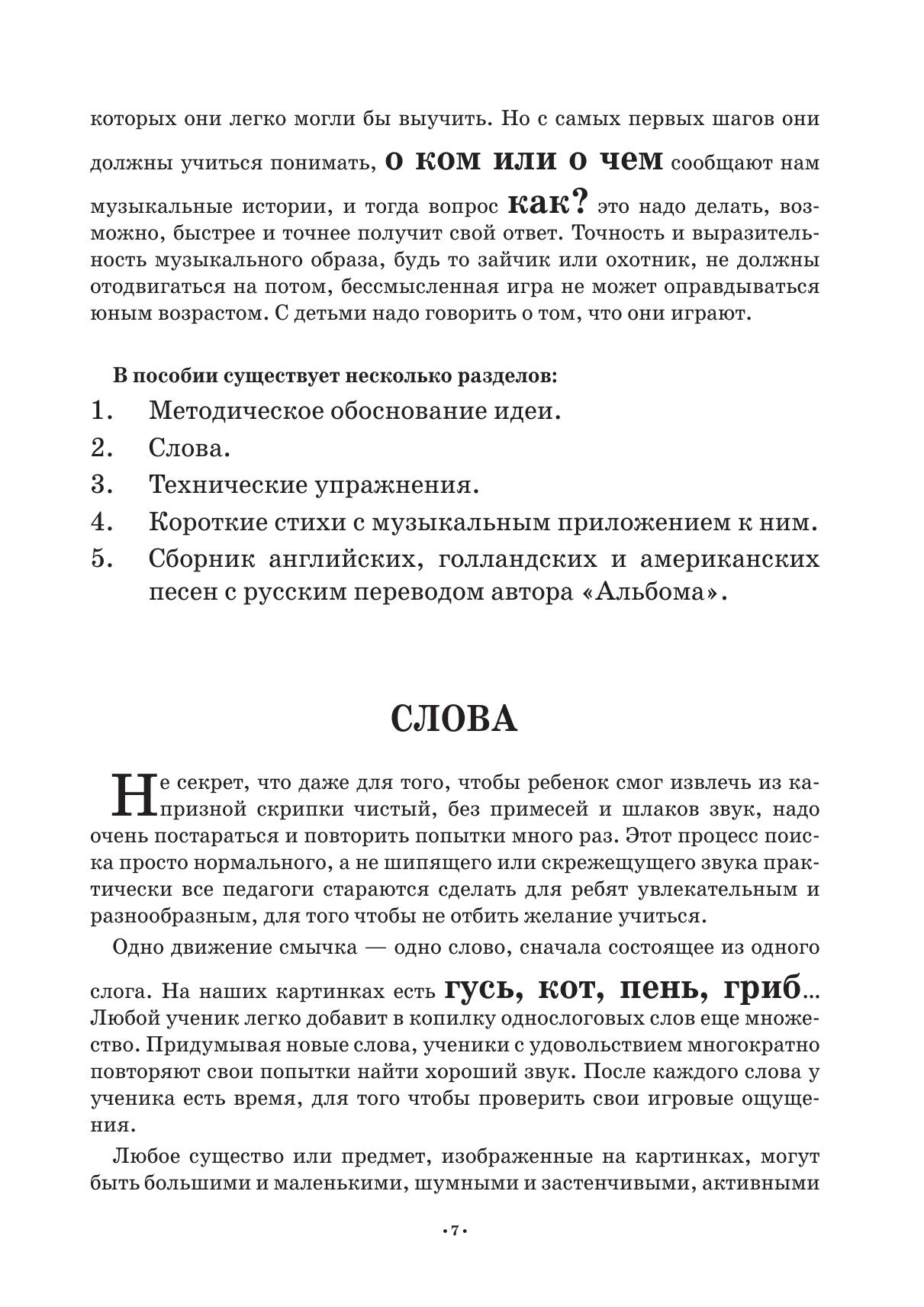История существования альбомного жанра богатая и разнообразная. Альбом всегда лежал в гостиной на видном месте, и каждый входящий в дом мог преобразить пустую страницу, вписав туда стихотворение или нотную строчку, вложив веточку цветущей лаванды, сорванную по дороге или нарисовав морской или какой-нибудь другой пейзаж. Постепенно страницы заполнялись, и альбом становился историей дома. В альбоме тоже будут стихи, нотные строчки, рисунки, представляющие собой историю вхождения в Музыку маленького человека, который услышал где-то скрипку и захотел учиться на ней играть. Издание адресовано педагогам и ученикам ДМШ и ДШИ, а также всем интересующимся скрипичным искусством. The history of the album genre is rich and varied. The album was always at a central place in the living room, and everyone entering the house could fill a blank page writing a poem or a musical line there, putting a sprig of blooming lavender, plucked along the way, or drawing a sea or some other landscape. Gradually, the pages were filled in, and the album turned into the history of the house. This album also contains poems, musical lines, drawings, which represent the story of the entry into Music of a little man who heard a violin somewhere and wanted to learn to play it. The edition is addressed to teachers and pupils of children's music schools and children's schools of arts, as well as everyone interested in the art of violin.