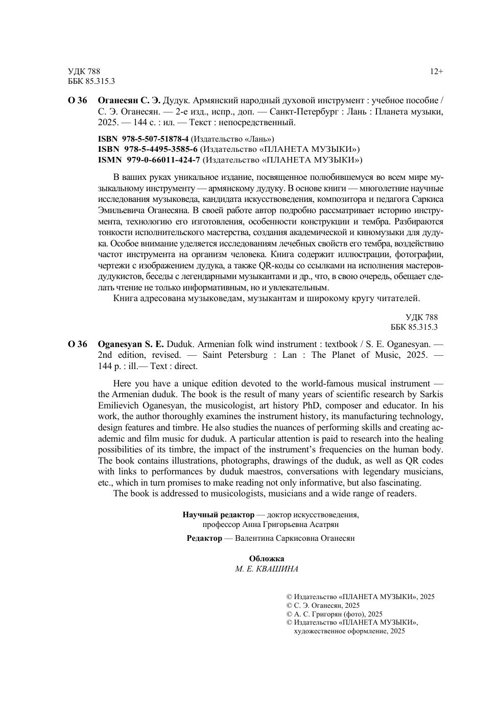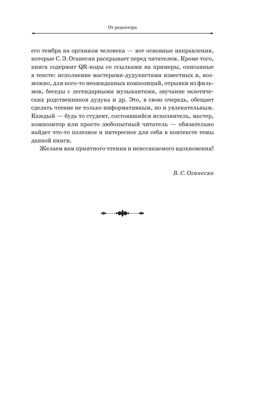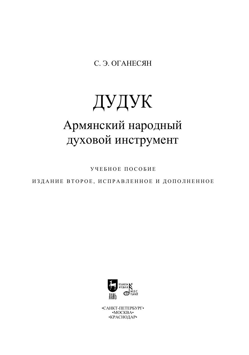 В Ваших руках уникальное издание, посвященное полюбившемуся во всем мире музыкальному инструменту – армянскому дудуку. В основе книги – многолетние научные исследования музыковеда, кандидата искусствоведения, композитора, педагога Саркиса Эмильевича Оганесяна. В своей работе автор подробно рассматривает историю инструмента, технологию его изготовления, особенности конструкции и тембра. Разбираются тонкости исполнительского мастерства, создания академической и киномузыки для дудука. Особое внимание уделяется исследованиям лечебных свойств его тембра, воздействию частот инструмента на организм человека. Книга содержит иллюстрации, фотографии, чертежи с изображением дудука, а также QR-коды со ссылками на исполнения мастеров дудукистов, беседы с легендарными музыкантами и др., что в свою очередь, обещает сделать чтение не только информативным, но и увлекательным. Книга адресована музыковедам, музыкантам и широкому кругу читателей. Here you have a unique edition devoted to the world-famous musical instrument — the Armenian duduk. The book is the result of many years of scientific research by Sarkis Emilievich Oganesyan, the musicologist, art history PhD, composer and educator. In his work, the author thoroughly examines the instrument history, its manufacturing technology, design features and timbre. He also studies the nuances of performing skills and creating academic and film music for duduk. A particular attention is paid to research into the healing possibilities of its timbre, the impact of the instrument’s frequencies on the human body. The book contains illustrations, photographs, drawings of the duduk, as well as QR codes with links to performances by duduk maestros, conversations with legendary musicians, etc., which in turn promises to make reading not only informative, but also fascinating. The book is addressed to musicologists, musicians and a wide range of readers.