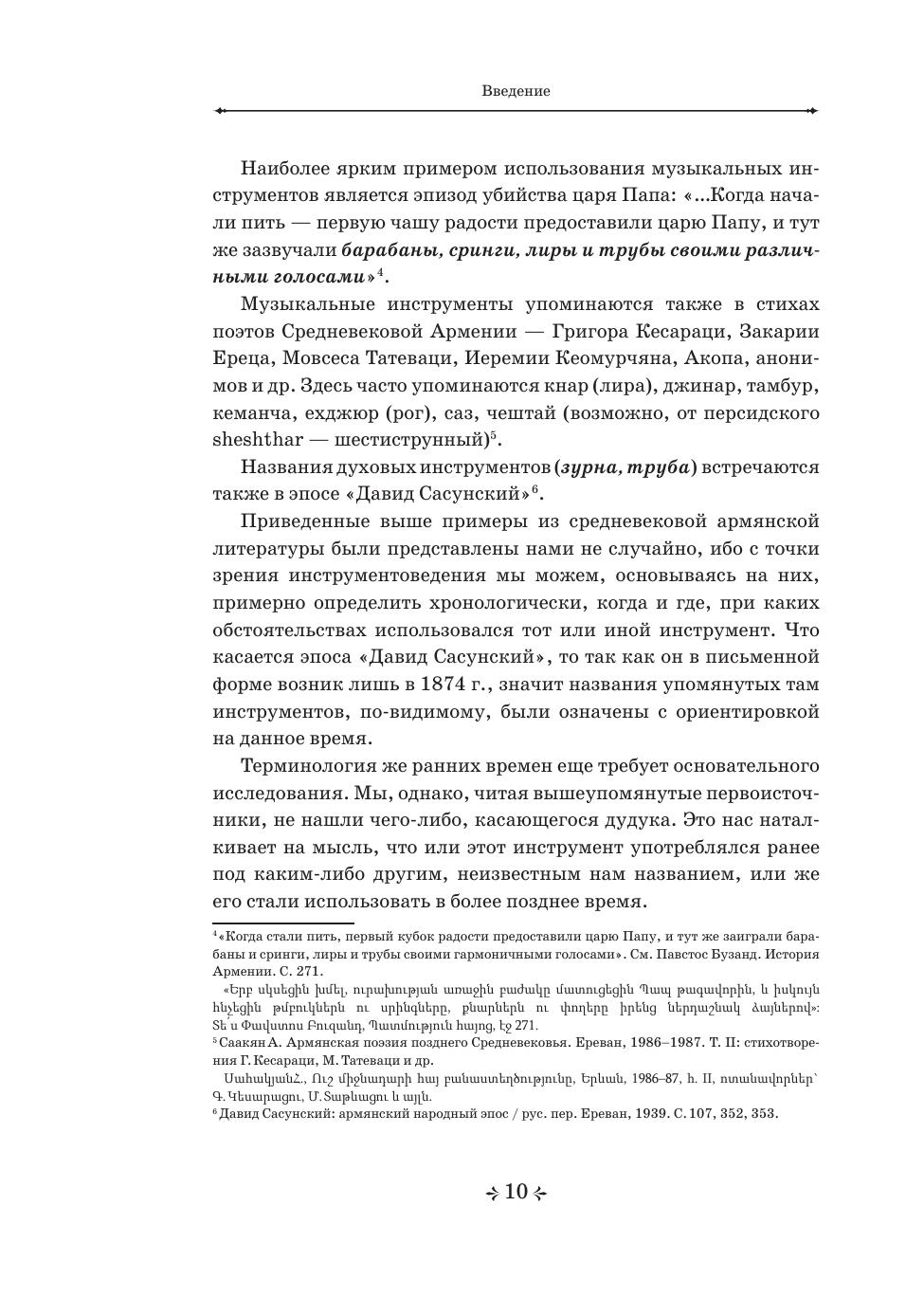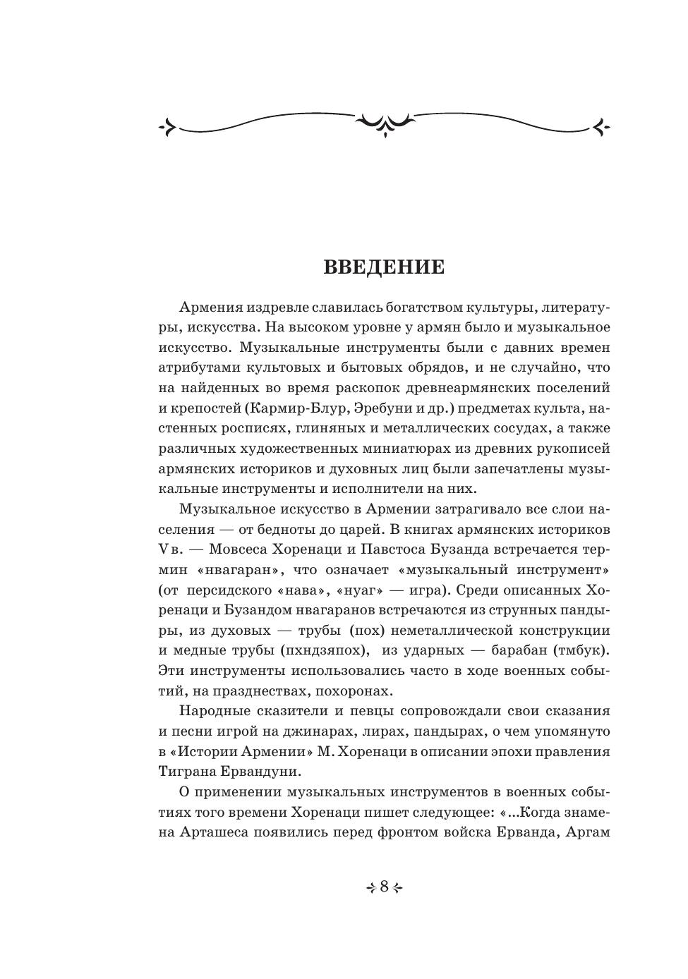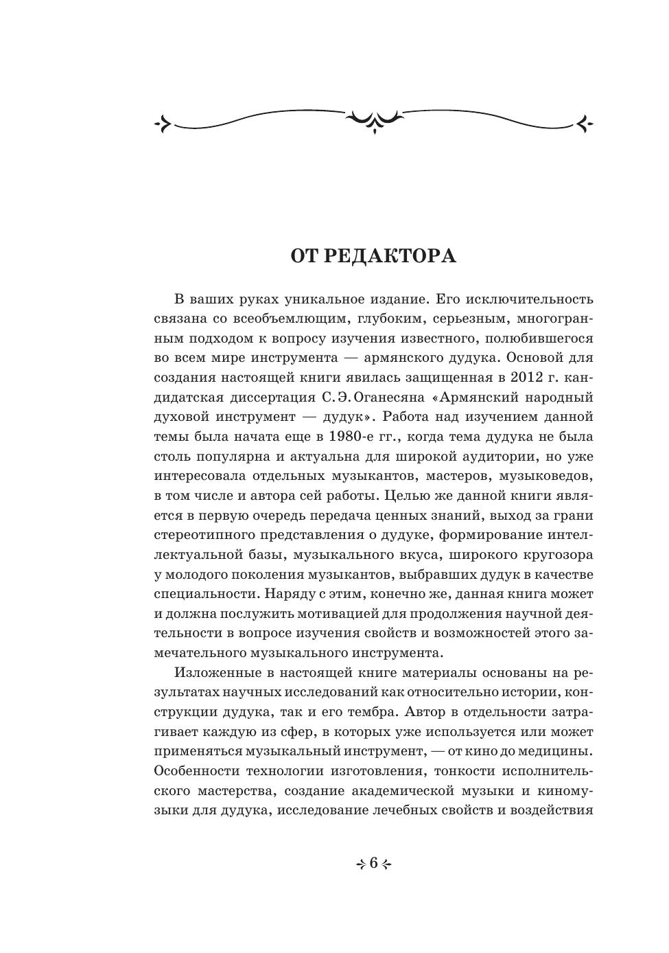 В Ваших руках уникальное издание, посвященное полюбившемуся во всем мире музыкальному инструменту – армянскому дудуку. В основе книги – многолетние научные исследования музыковеда, кандидата искусствоведения, композитора, педагога Саркиса Эмильевича Оганесяна. В своей работе автор подробно рассматривает историю инструмента, технологию его изготовления, особенности конструкции и тембра. Разбираются тонкости исполнительского мастерства, создания академической и киномузыки для дудука. Особое внимание уделяется исследованиям лечебных свойств его тембра, воздействию частот инструмента на организм человека. Книга содержит иллюстрации, фотографии, чертежи с изображением дудука, а также QR-коды со ссылками на исполнения мастеров дудукистов, беседы с легендарными музыкантами и др., что в свою очередь, обещает сделать чтение не только информативным, но и увлекательным. Книга адресована музыковедам, музыкантам и широкому кругу читателей. Here you have a unique edition devoted to the world-famous musical instrument — the Armenian duduk. The book is the result of many years of scientific research by Sarkis Emilievich Oganesyan, the musicologist, art history PhD, composer and educator. In his work, the author thoroughly examines the instrument history, its manufacturing technology, design features and timbre. He also studies the nuances of performing skills and creating academic and film music for duduk. A particular attention is paid to research into the healing possibilities of its timbre, the impact of the instrument’s frequencies on the human body. The book contains illustrations, photographs, drawings of the duduk, as well as QR codes with links to performances by duduk maestros, conversations with legendary musicians, etc., which in turn promises to make reading not only informative, but also fascinating. The book is addressed to musicologists, musicians and a wide range of readers.