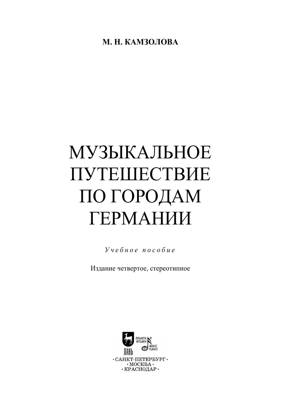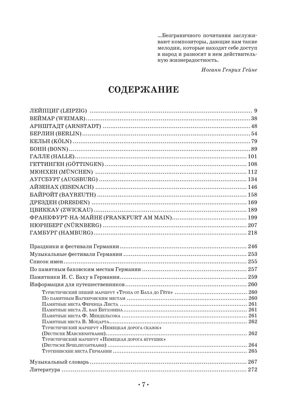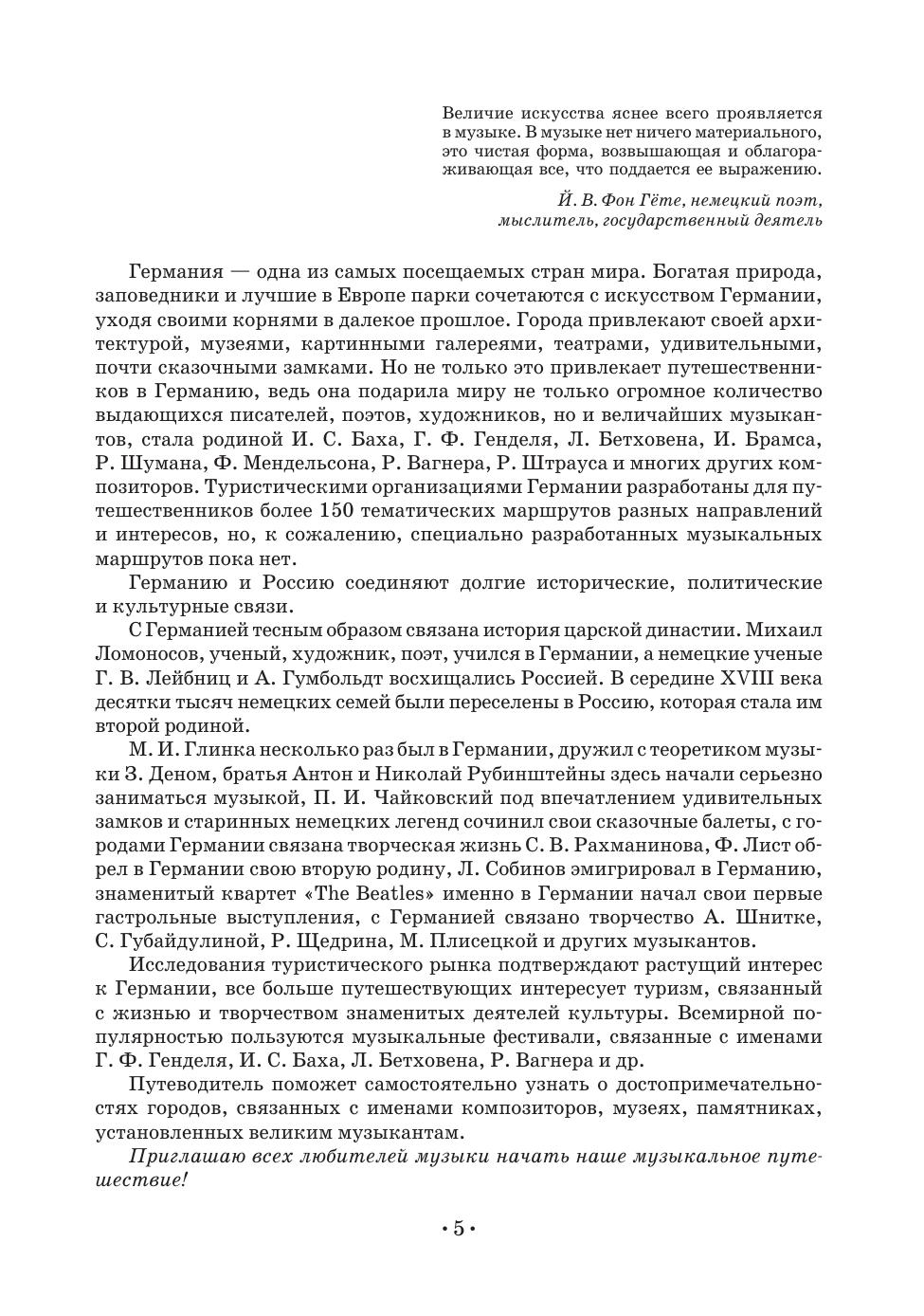 Музыкальный путеводитель включает путешествие по 17 городам Германии, краткую информацию о музыкальных местах городов, о композиторах, исполнителях, которые жили и творили в этих городах, о музыкальных конкурсах и фестивалях, проходящих в них, народных костюмированных праздниках и карнавалах, в которых могут принять участие все желающие туристы, ведь немцы проводят их больше, чем в других странах мира. Издание предлагается педагогам и учащимся музыкальных школ и школ искусств, их родителям, а также путешествующим любителям музыки.