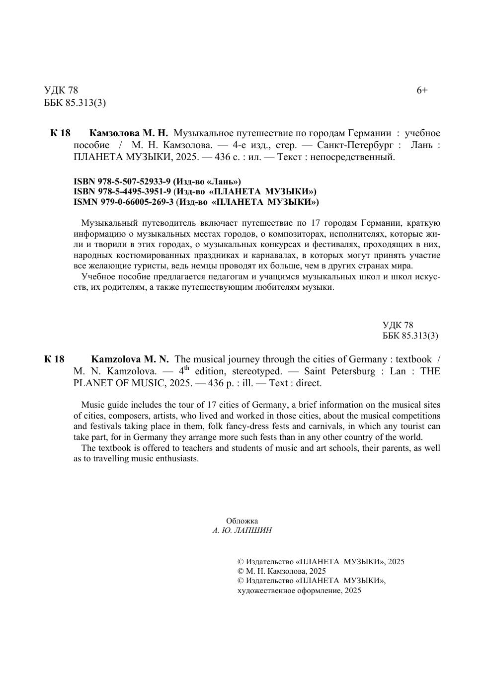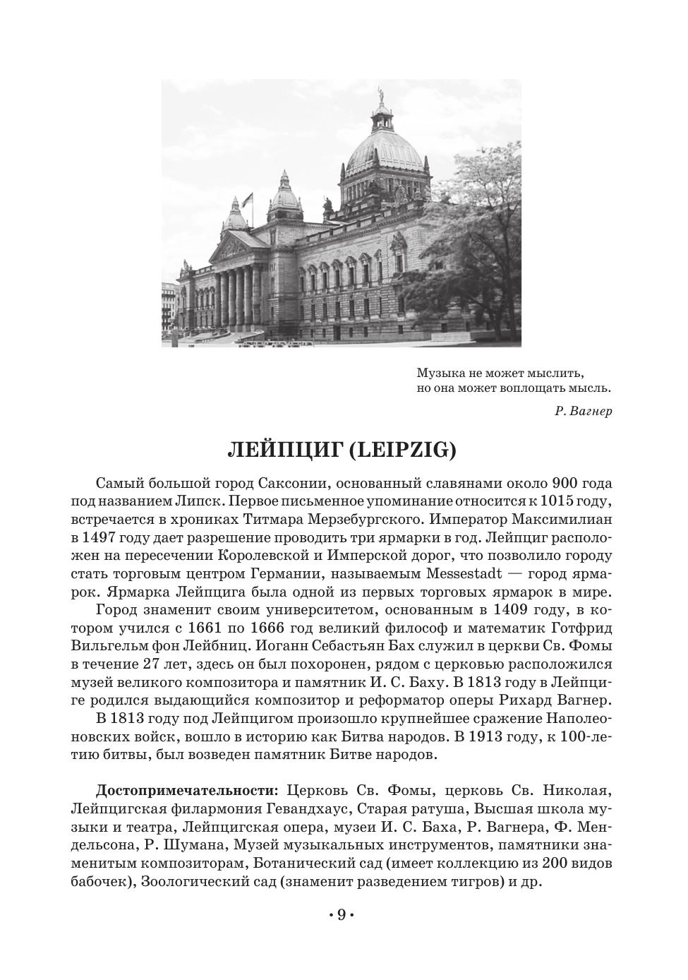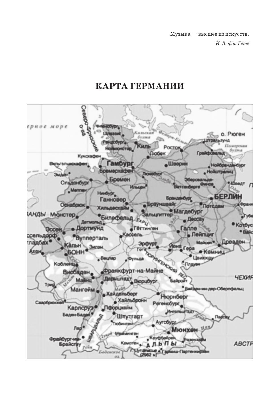 Музыкальный путеводитель включает путешествие по 17 городам Германии, краткую информацию о музыкальных местах городов, о композиторах, исполнителях, которые жили и творили в этих городах, о музыкальных конкурсах и фестивалях, проходящих в них, народных костюмированных праздниках и карнавалах, в которых могут принять участие все желающие туристы, ведь немцы проводят их больше, чем в других странах мира. Издание предлагается педагогам и учащимся музыкальных школ и школ искусств, их родителям, а также путешествующим любителям музыки.