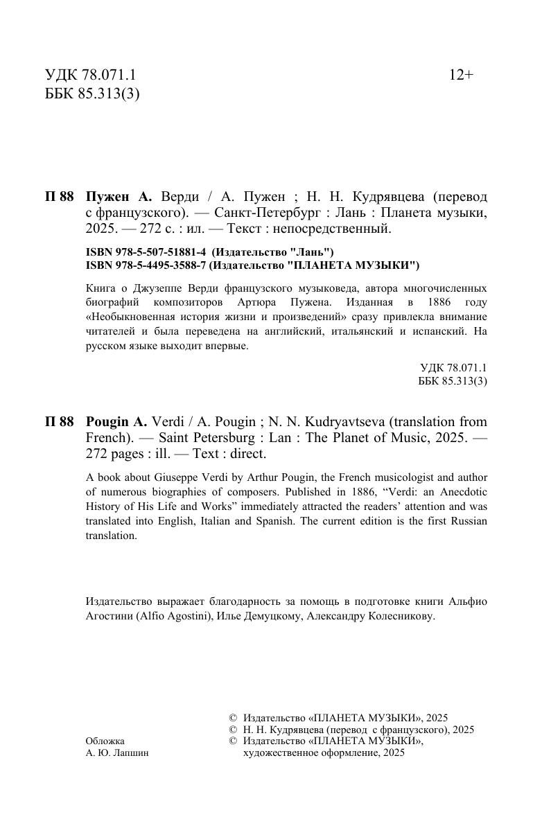 Книга о Джузеппе Верди французского музыковеда, автора многочисленных биографий композиторов Артюра Пужена. Изданная в 1886 году «Необыкновенная история жизни и произведений» сразу привлекла внимание читателей и была переведена на английский, итальянский и испанский. На русском языке выходит впервые. A book about Giuseppe Verdi by Arthur Pougin, the French musicologist and author of numerous biographies of composers. Published in 1886, “Verdi: an Anecdotic History of His Life and Works” immediately attracted the readers’ attention and was translated into English, Italian and Spanish. The current edition is the first Russian translation.