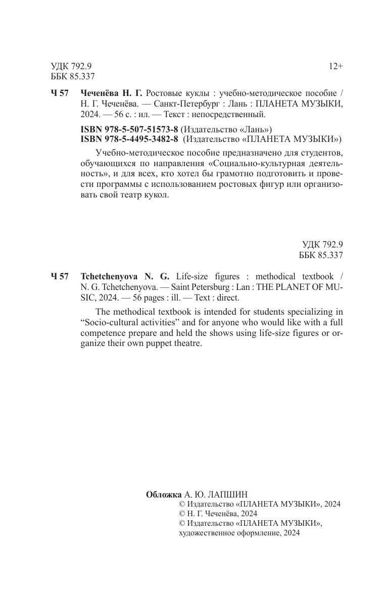 Учебно-методическое пособие предназначено для студентов, обучающихся по направления «Социально-культурная деятельность», и для всех, кто хотел бы грамотно подготовить и провести программы с использованием ростовых фигур или организовать свой театр кукол. The methodical textbook is intended for students specializing in “Socio-cultural activities” and for anyone who would like with a full competence prepare and held the shows using life-size figures or or- ganize their own puppet theatre.