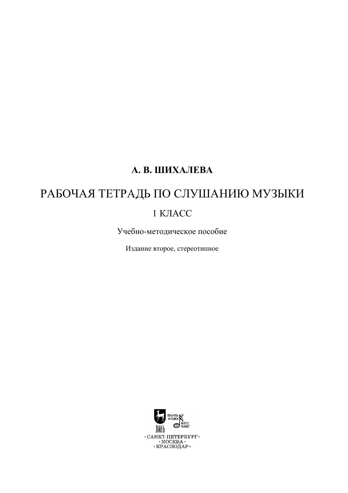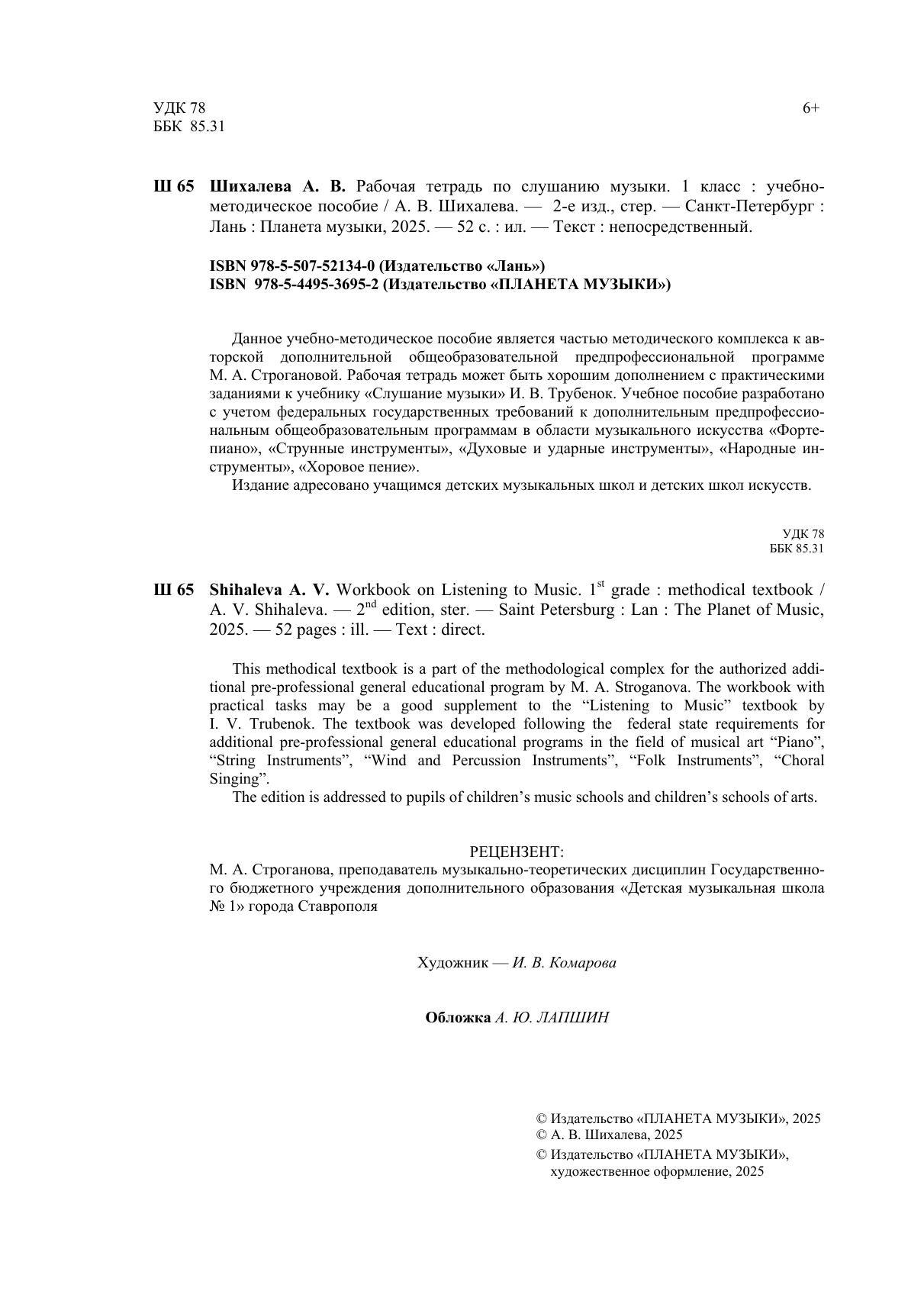 Данное учебно-методическое пособие является частью методического комплекса к ав-торской дополнительной общеобразовательной предпрофессиональной программе М. А. Строгановой. Рабочая тетрадь может быть хорошим дополнением с практическими заданиями к учебнику «Слушание музыки» И. В. Трубенок. Учебное пособие разработано с учетом федеральных государственных требований к дополнительным предпрофессиональным общеобразовательным программам в области музыкального искусства «Фортепиано», «Струнные инструменты», «Духовые и ударные инструменты», «Народные инструменты», «Хоровое пение». Издание адресовано учащимся детских музыкальных школ и детских школ искусств. This methodical textbook is a part of the methodological complex for the authorized addi-tional pre-professional general educational program by M. A. Stroganova. The workbook with practical tasks may be a good supplement to the “Listening to Music” textbook by I. V. Trubenok. The textbook was developed following the federal state requirements for additional pre-professional general educational programs in the field of musical art “Piano”, “String Instruments”, “Wind and Percussion Instruments”, “Folk Instruments”, “Choral Singing”. The edition is addressed to pupils of children’s music schools and children’s schools of arts.
