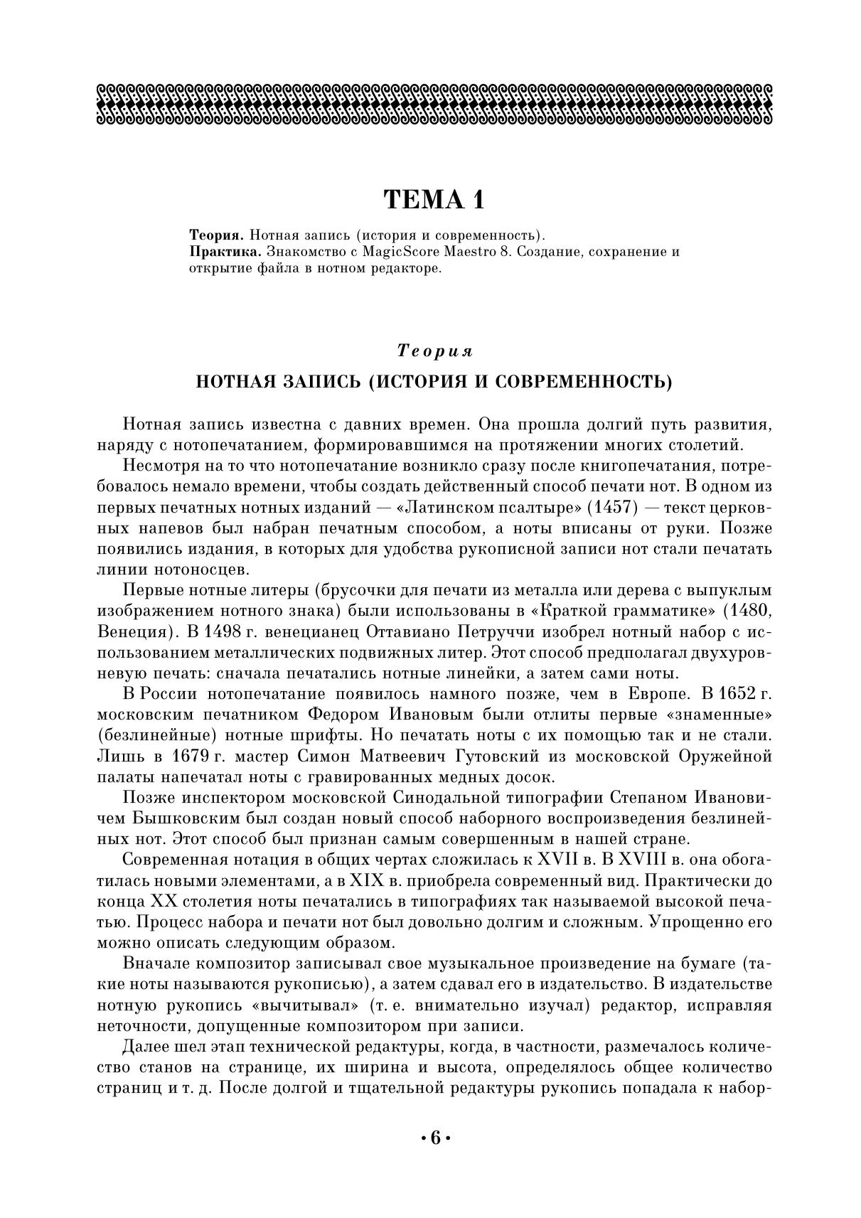 Издание предназначено для обучения навыкам современной компьютерной нотации с опорой на основные исторические сведения, стандарты и правила традиционной нотации. Оно может быть использовано в образовательных циклах как начального, так и среднего и отчасти высшего профессионального музыкального образования, в частности, в обучении по таким предметам, как «Музыкальная информатика», «Современная нотация», «Компьютерная музыка и аранжировка», «Электронные музыкальные инструменты», «Студия компьютерной музыки» и др. Учебник нацелен на получение теоретических знаний, а также формирование практических навыков создания и редактирования нотных текстов с помощью компьютерных программ MagicScore Maestro 8 и MagicScore Notation for MS Word. Адресовано студентам средних специальных учебных заведений.. The publication is intended for learning the modern computer notation based on the basic historical information, standards and rules of traditional notation. It can be used in educational cycles, both primary and secondary, and partially in higher professional music education, in particular, in courses such as "Musical Informatics", "Modern notation", "Computer Music and Orchestration", "Electronic Musical Instruments", "Computer Music Studio" and others. The textbook focuses on theoretical knowledge, as well as on the formation of practical skills for creating and editing musical scores using MagicScore Maestro 8 and MagicScore Notation for MS Word software. The textbook is intended for the students of colleges.
