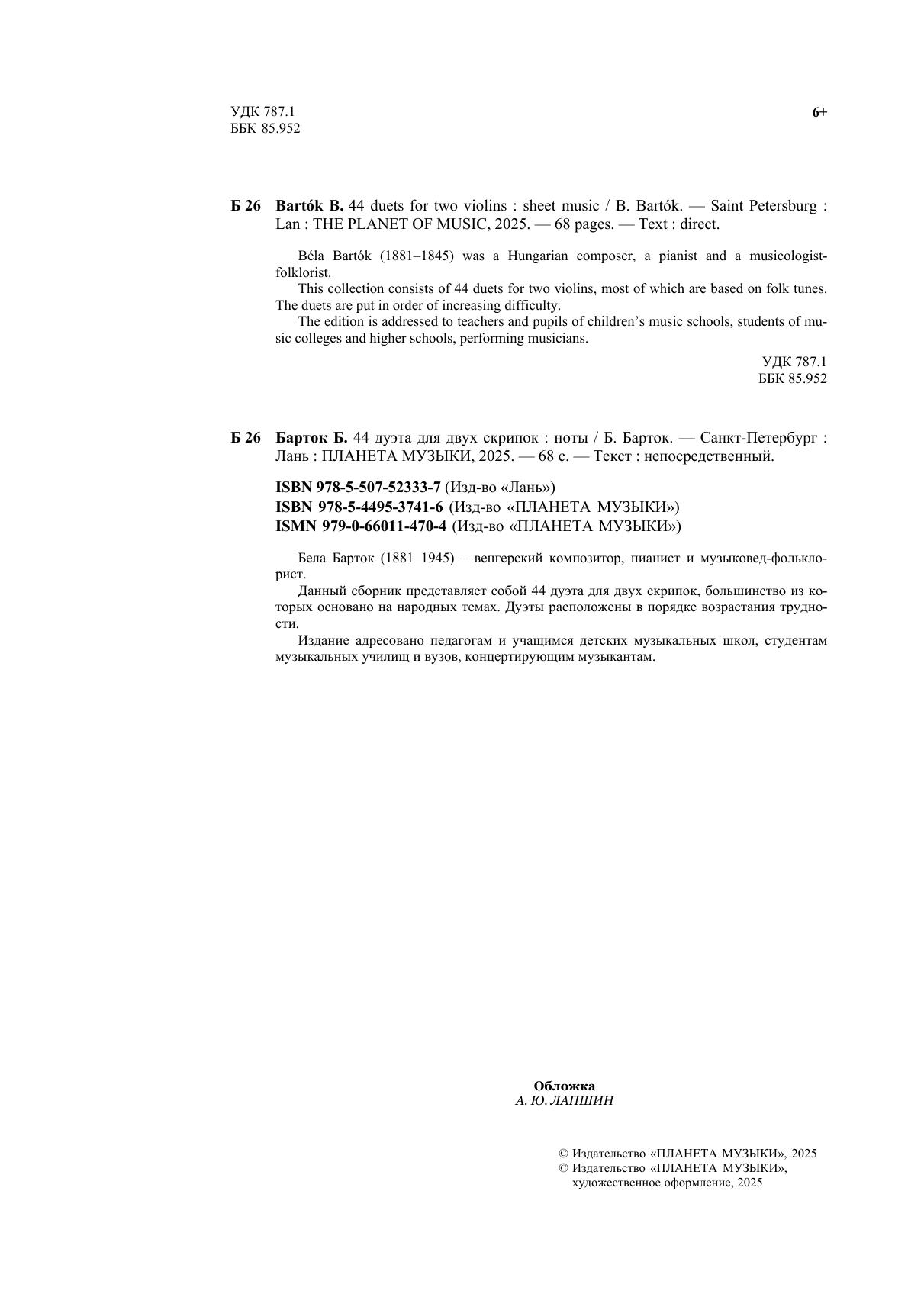 Бела Барток (1881–1945) – венгерский композитор, пианист и музыковед-фолькло-рист. Данный сборник представляет собой 44 дуэта для двух скрипок, большинство из ко-торых основано на народных темах. Дуэты расположены в порядке возрастания трудности. Издание адресовано педагогам и учащимся детских музыкальных школ, студентам музыкальных училищ и вузов, концертирующим музыкантам. Béla Bartók (1881–1845) was a Hungarian composer, a pianist and a musicologist-folklorist. This collection consists of 44 duets for two violins, most of which are based on folk tunes. The duets are put in order of increasing difficulty. The edition is addressed to teachers and pupils of children’s music schools, students of music colleges and higher schools, performing musicians.