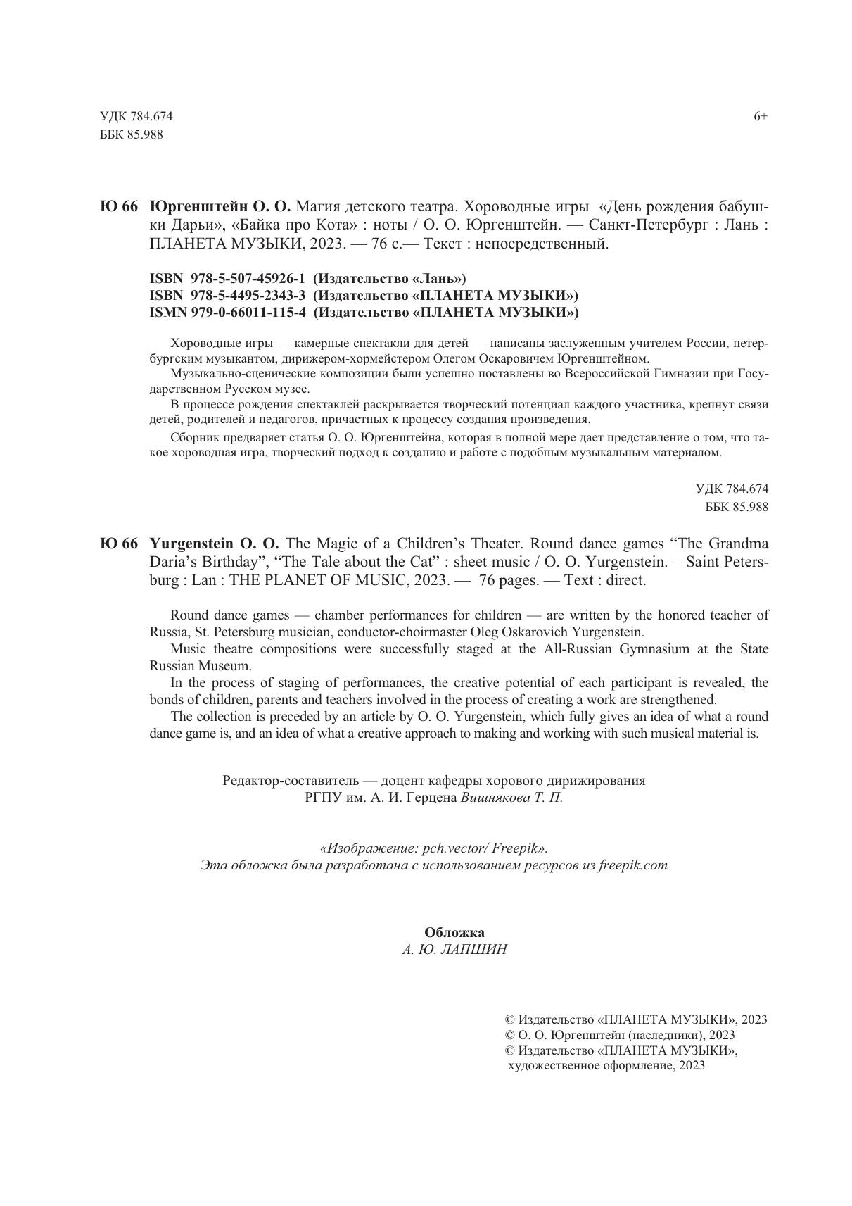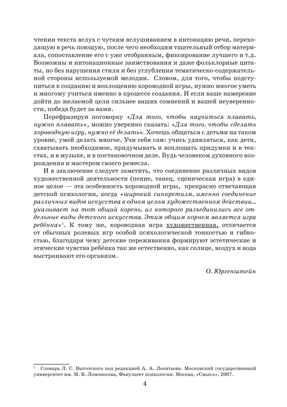 Хороводные игры — камерные спектакли для детей — написаны заслуженным учителем России, петербургским музыкантом, дирижером-хормейстером Олегом Оскаровичем Юргенштейном. Музыкально-сценические композиции были успешно поставлены во Всероссийской Гимназии при Государственном Русском музее. В процессе рождения спектаклей раскрывается творческий потенциал каждого участника, крепнут связи детей, родителей и педагогов, причастных к процессу создания произведения. Сборник предваряет статья О. О. Юргенштейна, которая в полной мере дает представление о том, что такое хороводная игра, творческий подход к созданию и работе с подобным музыкальным материалом. Round dance games — chamber performances for children — are written by the honored teacher of Russia, St. Petersburg musician, conductor-choirmaster Oleg Oskarovich Yurgenstein. Music theatre compositions were successfully staged at the All-Russian Gymnasium at the State Russian Museum. In the process of staging of performances, the creative potential of each participant is revealed, the bonds of children, parents and teachers involved in the process of creating a work are strengthened. The collection is preceded by an article by O. O. Yurgenstein, which fully gives an idea of what a round dance game is, and an idea of what a creative approach to making and working with such musical material is.