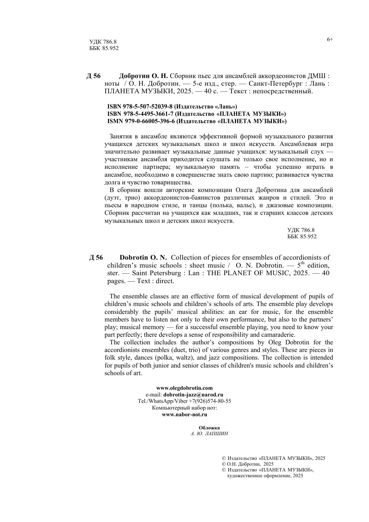 Занятия в ансамбле являются эффективной формой музыкального развития учащихся детских музыкальных школ и школ искусств. Ансамблевая игра значительно развивает музыкальные данные учащихся: музыкальный слух – участникам ансамбля приходится слушать не только свое исполнение, но и исполнение партнера, музыкальную память – чтобы успешно играть в ансамбле необходимо в совершенстве знать свою партию, развивается чувства долга и чувство товарищества. В сборник вошли авторские композиции Олега Добротина для ансамблей (дуэт, трио) аккордеонистов-баянистов различных жанров и стилей. Это и пьесы в народном стиле, и танцы (полька, вальс), и джазовые композиции. Сборник рассчитан на учащихся как младших, так и старших классов детских музыкальных школ и детских школ искусств. The ensemble classes are an effective form of musical development of pupils of children's music schools and children’s schools of arts. The ensemble play develops considerably the pupils' musical abilities: an ear for music, for the ensemble members have to listen not only to their own performance, but also to the partners’ play, musical memory – for a successful ensemble playing, you need to know your part perfectly, there develops a sense of responsibility and camaraderie. The collection includes the author's compositions by Oleg Dobrotin for the accordionists ensembles (duet, trio) of various genres and styles. These are pieces in folk style, dances (polka, waltz), and jazz compositions. The collection is intended for pupils of both junior and senior classes of children's music schools and children’s schools of art.