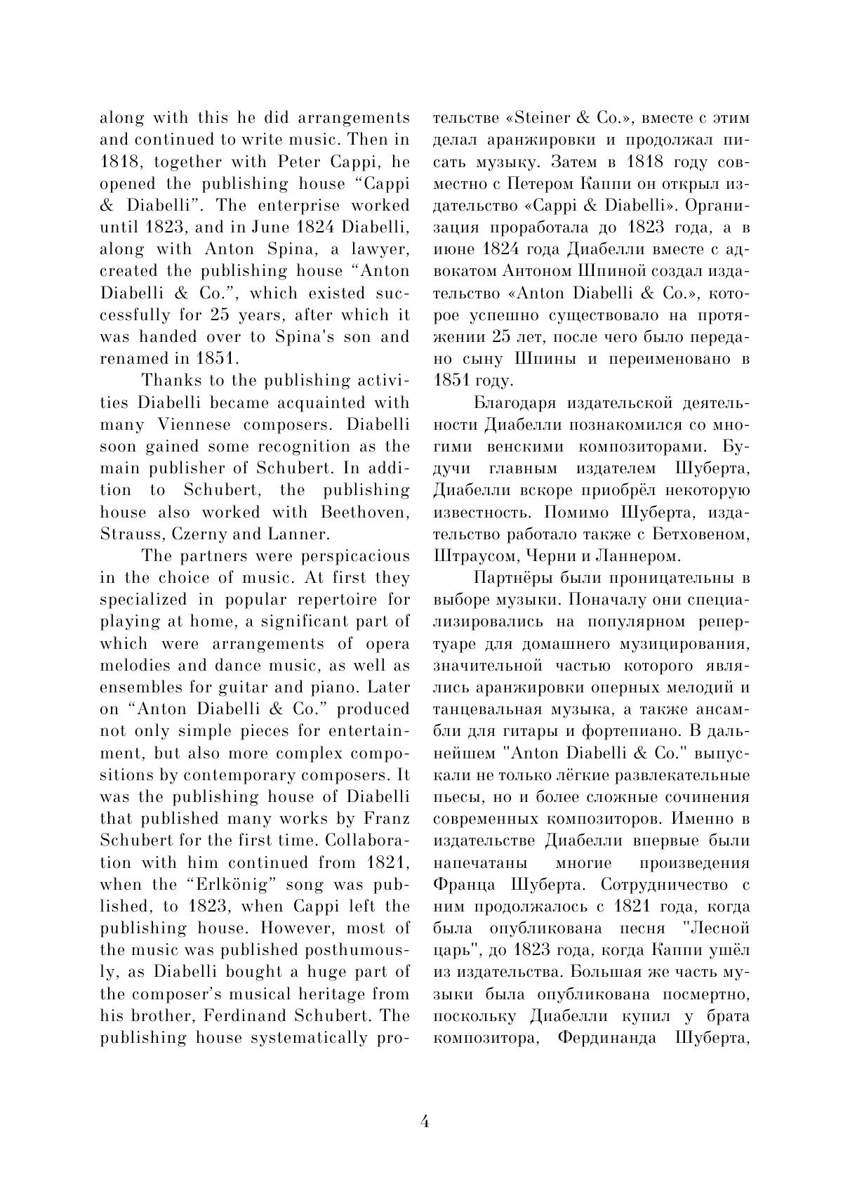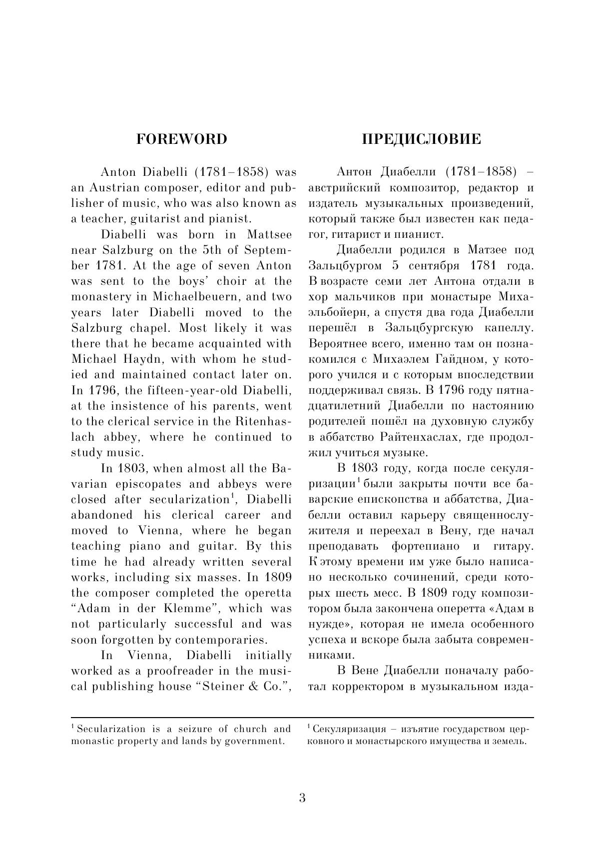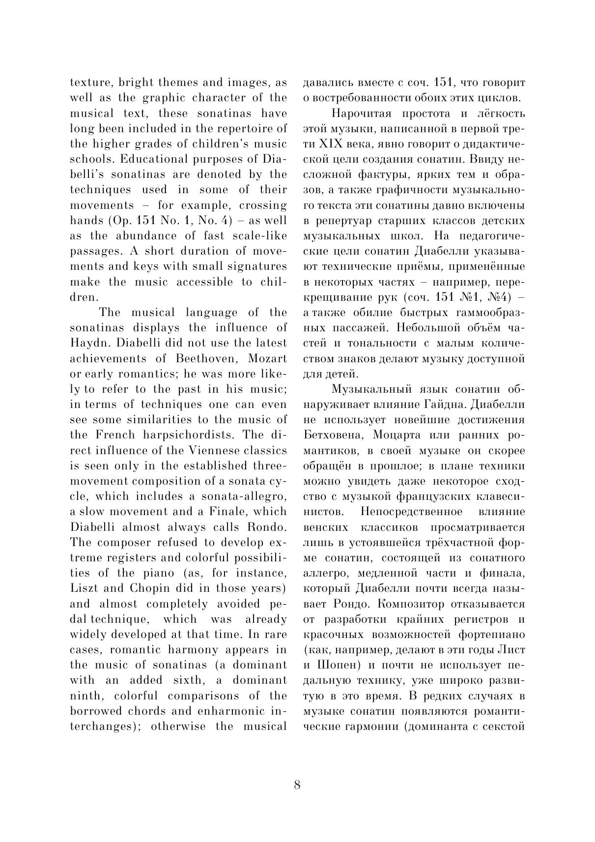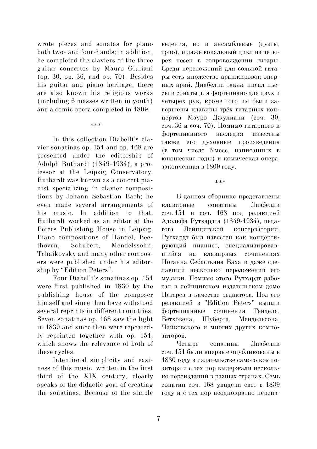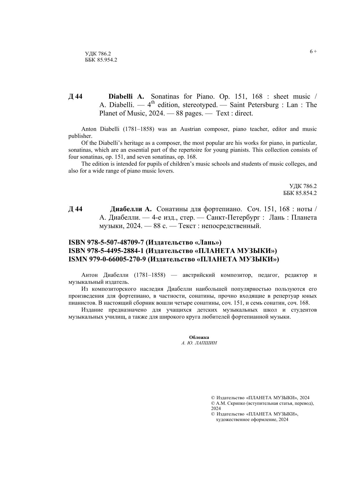 Антон Диабелли (1781–1858) – австрийский композитор, педагог, редактор и музыкальный издатель. Из композиторского наследия Диабелли наибольшей популярностью пользуются его произведения для фортепиано, в частности, сонатины, прочно входящие в репертуар юных пианистов. В настоящий сборник вошли четыре сонатины, соч. 151, и семь сонатин, соч. 168. Издание предназначено для учащихся детских музыкальных школ и студентов музыкальных училищ, а также для широкого круга любителей фортепианной музыки.