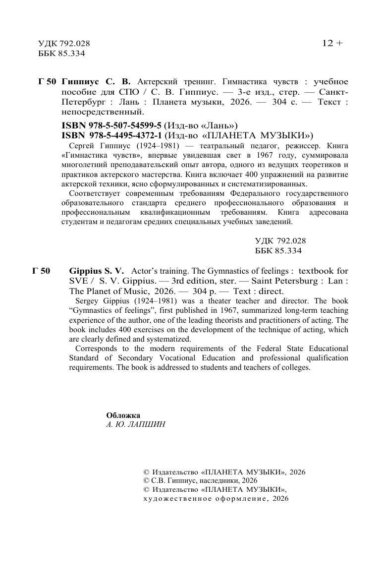 Cергей Гиппиус,1924–1981 – театральный педагог, режиссер. Книга Гимнастика чувств, впервые увидевшая свет в 1967 году, суммировала многолетний преподавательский опыт автора, одного из ведущих теоретиков и практиков актерского мастерства. Книга включает 400 упражнений на развитие актерской техники, ясно сформулированных и систематизированных. Соответствует современным требованиям Федерального государственного образовательного стандарта среднего профессионального образования и профессиональным квалификационным требованиям. Книга адресована студентам и педагогам средних специальных учебных заведений. Sergey Gippius, 1924-1981 was a theater teacher and director. The book Gymnastics of feelings, first published in 1967, summarized long-term teaching experience of the author, one of the leading theorists and practitioners of acting. The book includes 400 exercises on the development of the technique of acting, which are clearly defined and systematized. Corresponds to the modern requirements of the Federal State Educational Standard of Secondary Vocational Education and professional qualification requirements. The book is addressed to students and teachers of colleges.