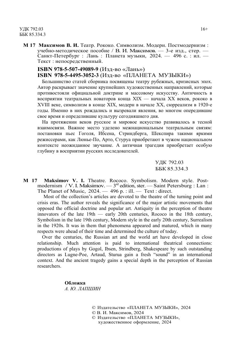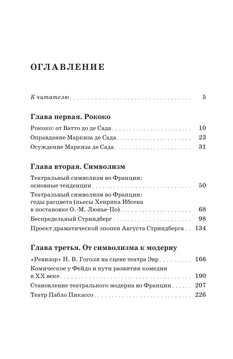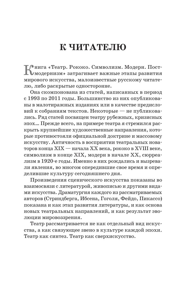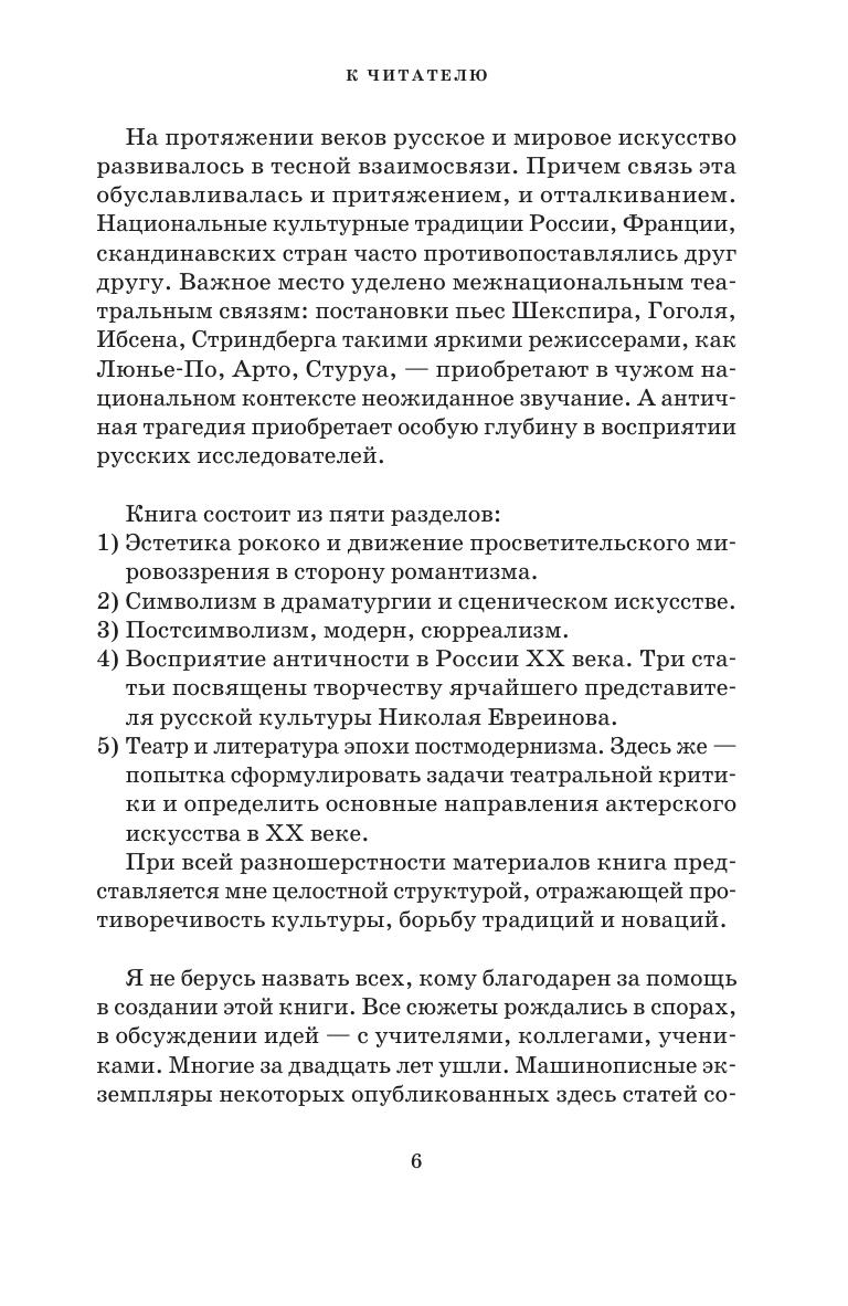 Большинство статей сборника посвящены театру рубежных, кризисных эпох. Автор раскрывает значение крупнейших художественных направлений, которые противостояли официальной доктрине и искусству массовому. Античность в восприятии театральных новаторов конца XIX - начала ХХ веков, рококо в XVIII веке, символизм в конце XIX, модерн в начале XX, сюрреализм в 1920-е годы. Именно в них рождались и вызревали явления, во многом опередившие свое время и определившие культуру сегодняшнего дня. На протяжении веков русское и мировое искусство развивалось в тесной взаимосвязи. Важное место уделено межнациональным театральным связям: постановки пьес Гоголя, Ибсена, Стриндберга, Шекспира такими яркими режиссерами, как Люнье-По, Арто, Стуруа приобретают в чужом национальном контексте неожиданное звучание. А античная трагедия приобретает особую глубину в восприятии русских исследователей. Most of the collection’s articles are devoted to the theatre of the turning point and crisis eras. The author reveals the significance of the major artistic movements that opposed the official doctrine and popular art. Antiquity in the perception of theatre innovators of the late 19th — early 20th centuries, Rococo in the 18th century, Symbolism in the late 19th century, Modern style in the early 20th century, Surrealism in the 1920s. It was in them that phenomena appeared and matured, which in many respects were ahead of their time and determined the culture of today. Over the centuries, the Russian art and the world art have developed in close relationship. Much attention is paid to international theatrical connections: productions of plays by Gogol, Ibsen, Strindberg, Shakespeare by such outstanding directors as Lugné-Poë, Artaud, Sturua gain a fresh “sound” in an international context. And the ancient tragedy gains a special depth in the perception of Russian researchers.