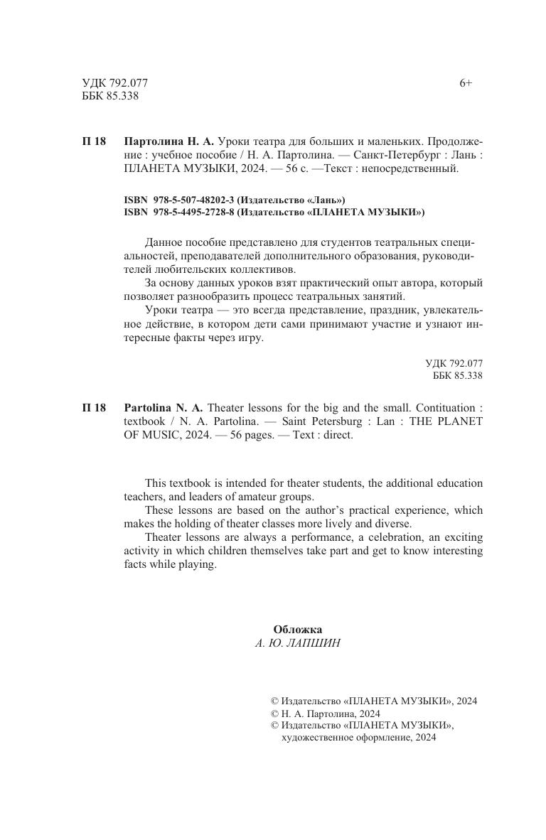 Данное пособие представлено для студентов театральных специальностей, преподавателей дополнительного образования, руководителей любительских коллективов. За основу данных уроков взят практический опыт автора, который позволяет разнообразить процесс театральных занятий. Уроки театра – это всегда представление, праздник, увлекательное действие, в котором дети сами принимают участие и узнают интересные факты через игру. This textbook is intended for theater students, the additional education teachers, and leaders of amateur groups. These lessons are based on the author’s practical experience, which makes the holding of theater classes more lively and diverse. Theater lessons are always a performance, a celebration, an exciting activity in which children themselves take part and get to know interesting facts while playing.