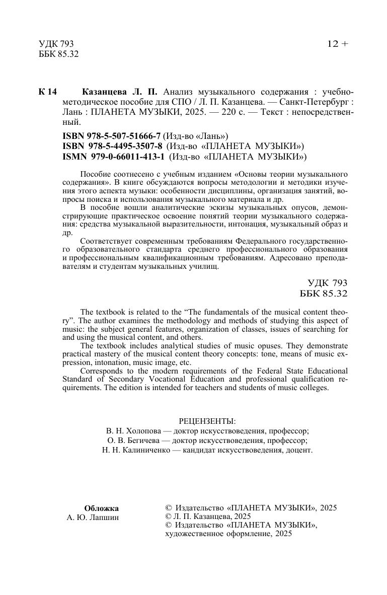 Пособие соотнесено с учебным изданием «Основы теории музыкального содержания». В книге обсуждаются вопросы методологии и методики изучения этого аспекта музыки: особенности дисциплины, организация занятий, вопросы поиска и использования музыкального материала и др. В пособие вошли аналитические эскизы музыкальных опусов, демон-стрирующие практическое освоение понятий теории музыкального содержания: средства музыкальной выразительности, интонация, музыкальный образ и др. Соответствует современным требованиям Федерального государственного образовательного стандарта среднего профессионального образования и профессиональным квалификационным требованиям. Адресовано преподавателям и студентам музыкальных училищ. The textbook is related to the “The fundamentals of the musical content theory”. The author examines the methodology and methods of studying this aspect of music: the subject general features, organization of classes, issues of searching for and using the musical content, and others. The textbook includes analytical studies of music opuses. They demonstrate practical mastery of the musical content theory concepts: tone, means of music expression, intonation, music image, etc. Corresponds to the modern requirements of the Federal State Educational Standard of Secondary Vocational Education and professional qualification requirements. The edition is intended for teachers and students of music colleges.