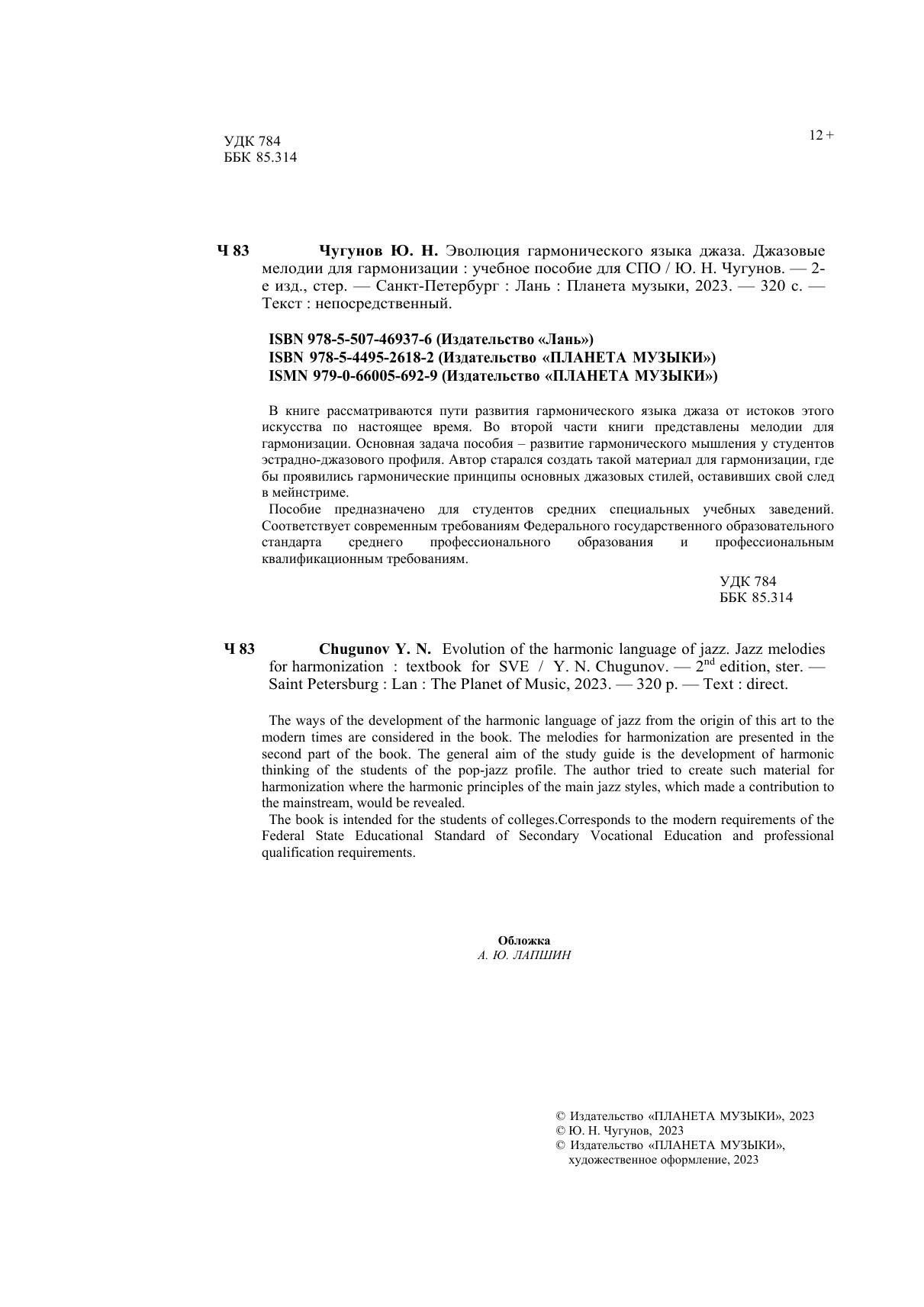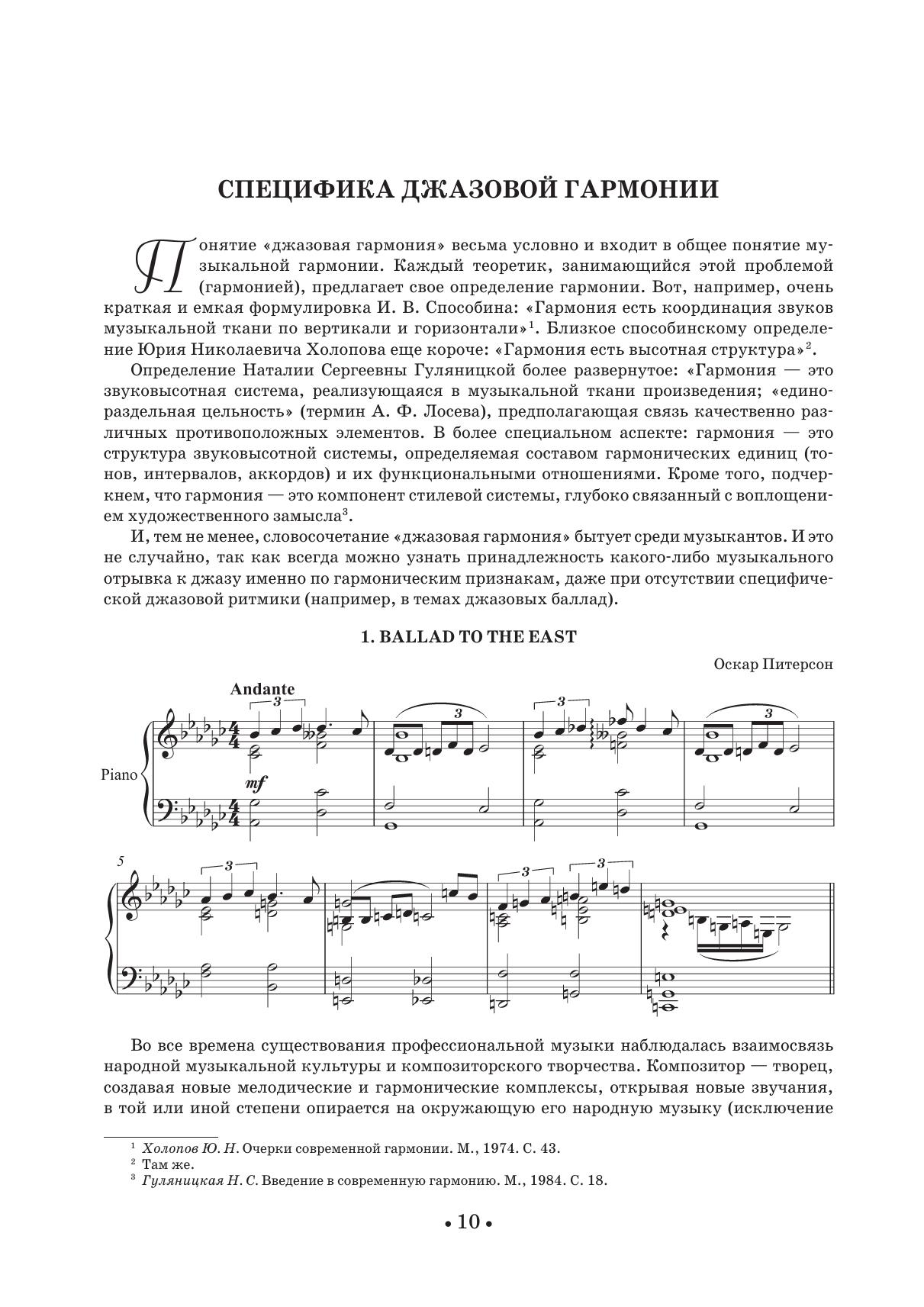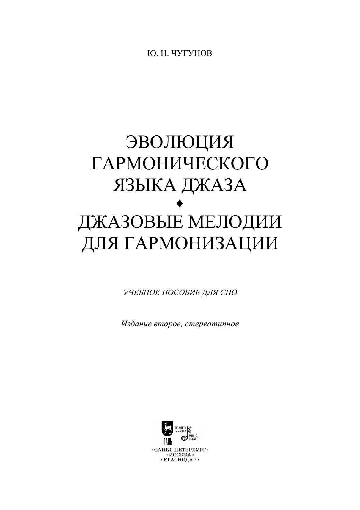 В книге рассматриваются пути развития гармонического языка джаза от истоков этого искусства по настоящее время. Во второй части книги представлены мелодии для гармонизации. Основная задача пособия – развитие гармонического мышления у студентов эстрадно-джазового профиля. Автор старался создать такой материал для гармонизации, где бы проявились гармонические принципы основных джазовых стилей, оставивших свой след в мейнстриме. Пособие предназначено для студентов средних специальных учебных заведений. The ways of the development of the harmonic language of jazz from the origin of this art to the modern times are considered in the book. The melodies for harmonization are presented in the second part of the book. The general aim of the study guide is the development of harmonic thinking of the students of the pop-jazz profile. The author tried to create such material for harmonization where the harmonic principles of the main jazz styles, which made a contribution to the mainstream, would be revealed. The book is intended for the students of colleges.
