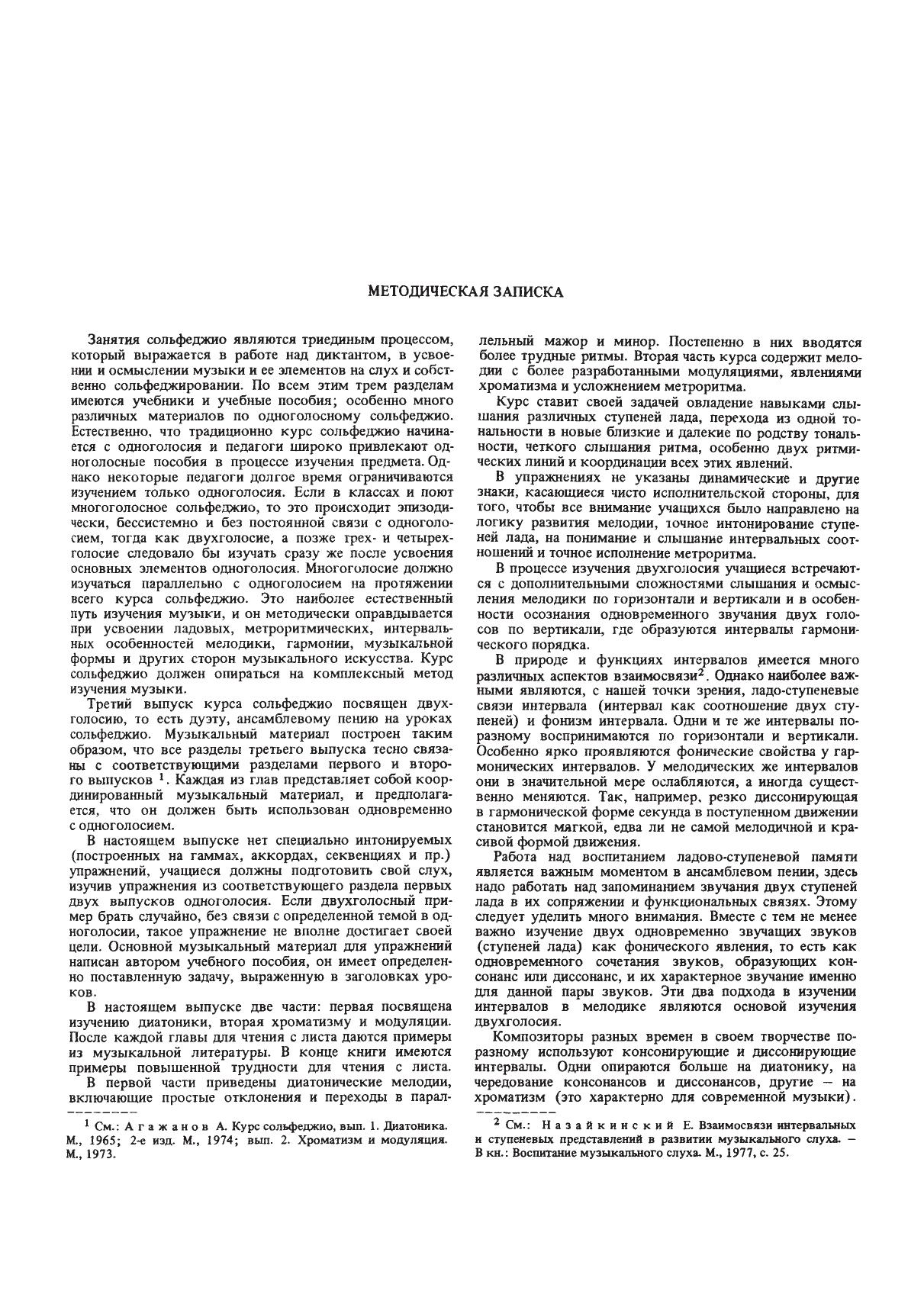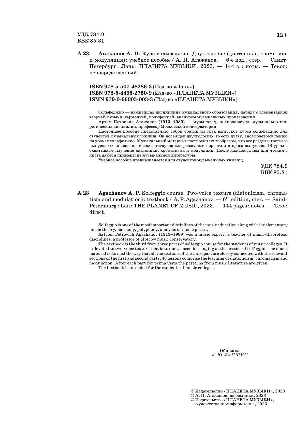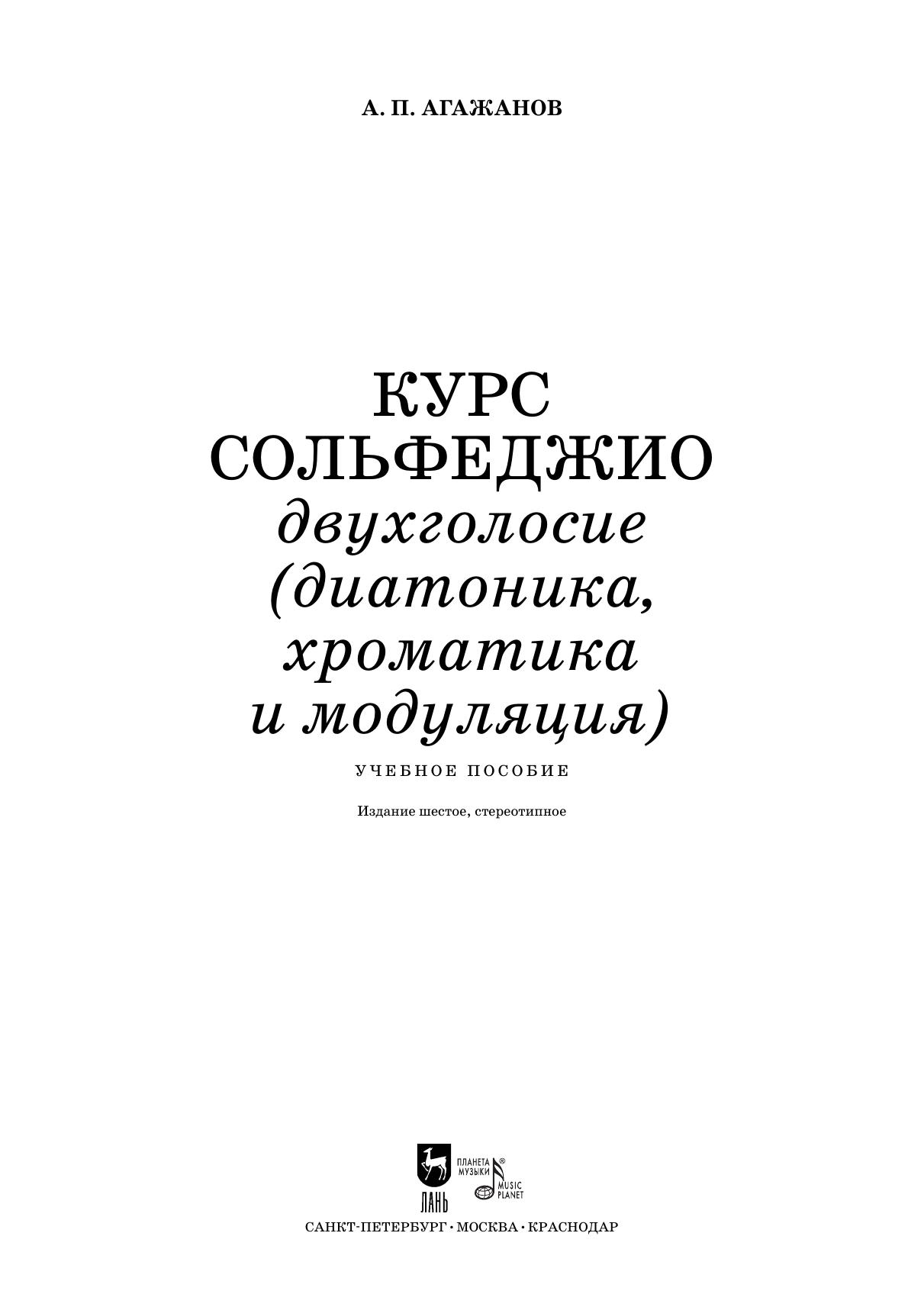 Сольфеджио — важнейшая дисциплина музыкального образования, наряду с элементарной теорией музыки, гармонией, полифонией, анализом музыкальных произведений. Артем Петрович Агажанов (1913–1989) — музыковед, преподаватель музыкально-тео-ретических дисциплин, профессор Московской консерватории. Настоящее пособие представляет собой третий из трех выпусков курса сольфеджио для студентов музыкальных училищ. Он посвящен двухголосию, то есть дуэту, ансамблевому пению на уроках сольфеджио. Музыкальный материал построен таким образом, что все разделы третьего выпуска тесно связаны с соответствующими разделами первого и второго выпусков. 48 уроков охватывают изучение диатоники, хроматизма и модуляции. После каждой главы для чтения с листа даются примеры из музыкальной литературы. Учебное пособие предназначается для студентов вузов и ссузов. Solfeggio is one of the most important disciplines of the music education along with the elementary music theory, harmony, polyphony, analysis of music pieces. Artyom Petrovich Agazhanov (1913–1989) was a music expert, a teacher of music-theoretical disciplines, a professor of Moscow music conservatory. The textbook is the third from three parts of solfeggio course for the students of music colleges. It is devoted to two-voice texture that is to duet, ensemble singing at the lessons of solfeggio. The music material is formed the way that all the sections of the third part are closely connected with the relevant sections of the first and second parts. 48 lessons comprise the learning of diatonicism, chromatism and modulation. After each part for prima vista the patterns from music literature are given. The textbook is intended for the students of colleges and high schools.