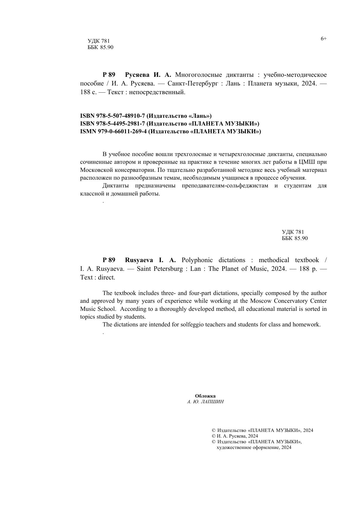 В учебное пособие вошли трёхголосные и четырёхголосные диктанты, специально сочинённые автором и проверенные на практике в течение многих лет работы в ЦМШ при Московской консерватории. По тщательно разработанной методике весь учебный материал расположен по разнообразным темам, необходимым учащимся в процессе обучения. Диктанты предназначены преподавателям-сольфеджистам и студентам для классной и домашней работы. The textbook includes three- and four-part dictations, specially composed by the author and approved by many years of experience while working at the Moscow Concervatory Center Music School. According to a thoroughly developed method, all educational material is sorted in topics studied by students. The dictations are intended for solfeggio teachers and students for class and homework.