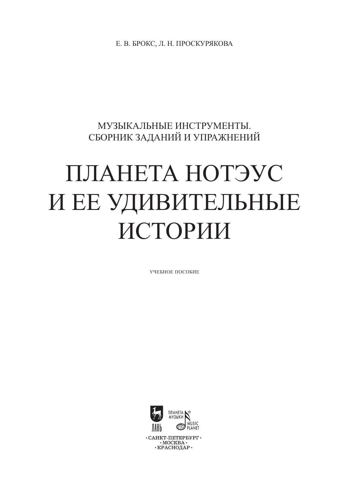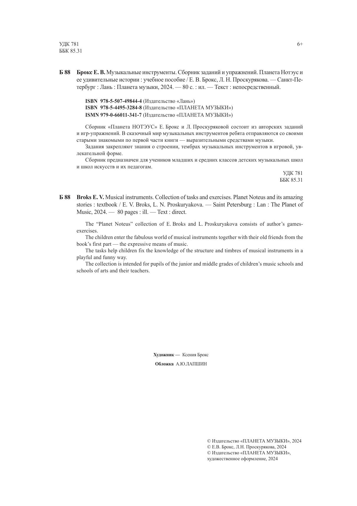 Сборник «Планета НОТЭУС» Е. Брокс и Л. Проскуряковой состоит из авторских заданий и игр-упражнений. В сказочный мир музыкальных инструментов ребята отправляются со своими старыми знакомыми по первой части книги – выразительными средствами музыки. Задания закрепляют знания о строении, тембрах музыкальных инструментов в игровой, увлекательной форме. Сборник предназначен для учеников младших и средних классов детских музыкальных школ и школ искусств и их педагогам. The “Planet Noteus” collection of E. Broks and L. Proskuryakova consists of author’s games- exercises. The children enter the fabulous world of musical instruments together with their old friends from the book’s first part — the expressive means of music. The tasks help children fix the knowledge of the structure and timbres of musical instruments in a playful and funny way. The collection is intended for pupils of the junior and middle grades of children’s music schools and schools of arts and their teachers.