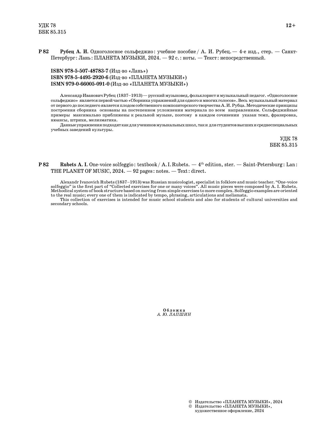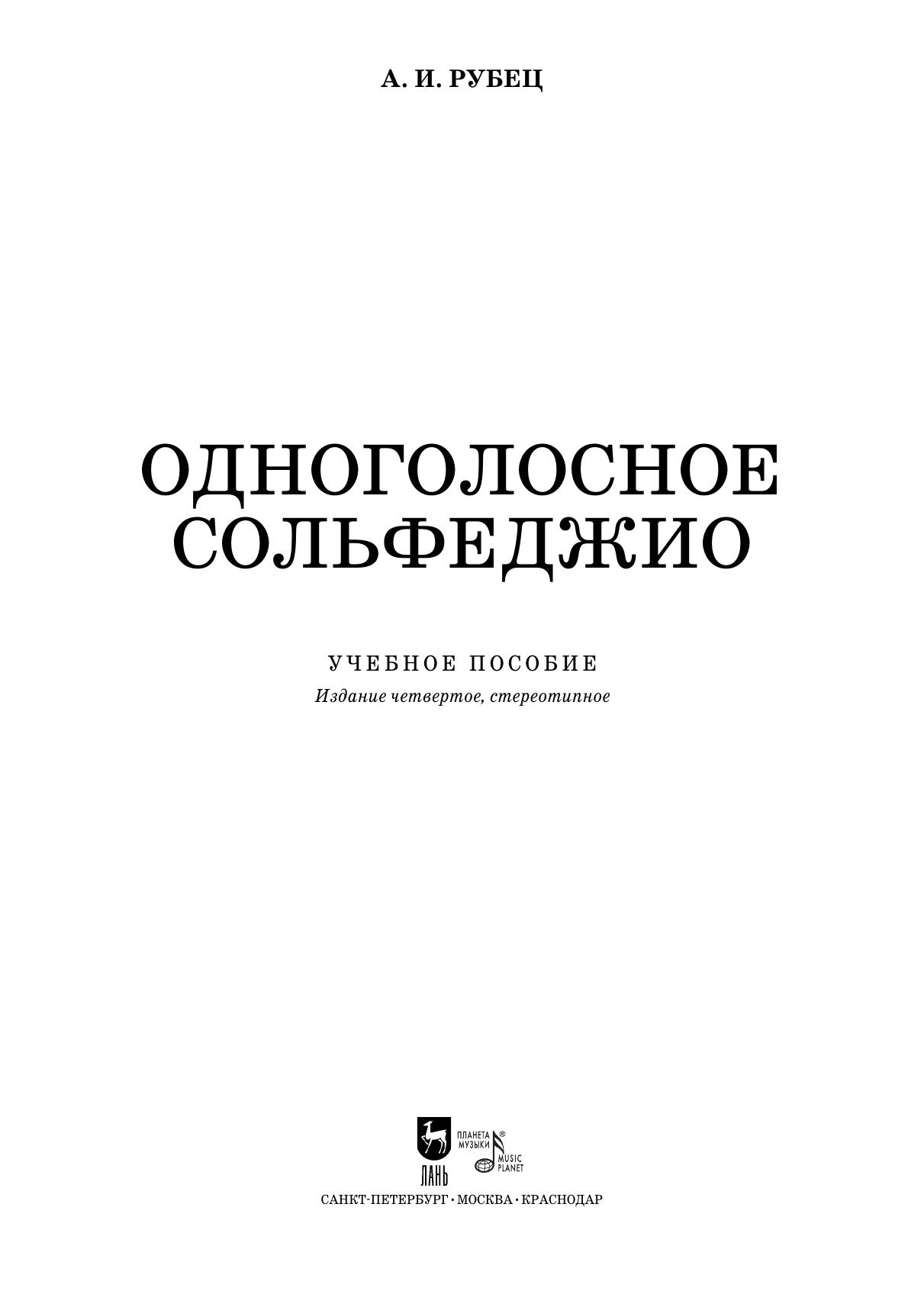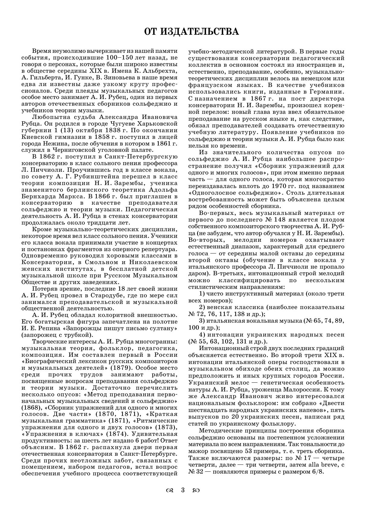 Александр Иванович Рубец (1837–1913) — русский музыковед, фольклорист и музыкальный педагог. «Одноголосное сольфеджио» является первой частью «Сборника упражнений для одного и многих голосов». Весь музыкальный материал от первого до последнего является плодом собственного композиторского творчества А. И. Рубца. Методические принципы построения сборника основаны на постепенном усложнении материала по всем направлениям. Сольфеджийные примеры максимально приближены к реальной музыке, поэтому в каждом сочинении указан темп, фразировка, нюансы, штрихи, мелизматика. Данные упражнения подходят как для учеников музыкальных школ, так и для студентов высших и среднеспециальных учебных заведений культуры.