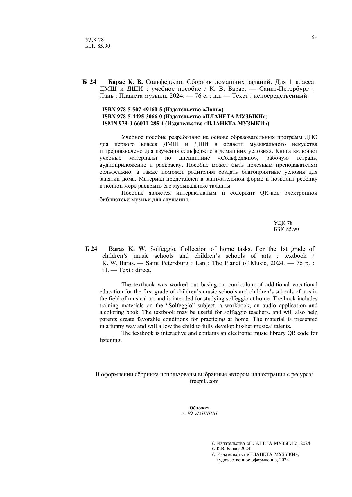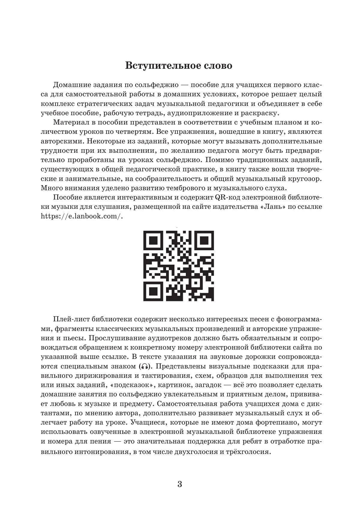 Учебное пособие разработано на основе образовательных программ ДПО для первого класса ДМШ и ДШИ в области музыкального искусства и предназначено для изучения сольфеджио в домашних условиях. Книга включает учебные материалы по дисциплине «Сольфеджио», рабочую тетрадь, аудиоприложение и раскраску. Пособие может быть полезным преподавателям сольфеджио, а также поможет родителям создать благоприятные условия для занятий дома. Материал представлен в занимательной форме и позволит ребенку в полной мере раскрыть его музыкальные таланты. Пособие является интерактивным и содержит QR-код электронной библиотеки музыки для слушания. The textbook was worked out basing on curriculum of additional vocational education for the first grade of children’s music schools and children’s schools of arts in the field of musical art and is intended for studying solfeggio at home. The book includes training materials on the “Solfeggio” subject, a workbook, an audio application and a coloring book. The textbook may be useful for solfeggio teachers, and will also help parents create favorable conditions for practicing at home. The material is presented in a funny way and will allow the child to fully develop his/her musical talents. The textbook is interactive and contains an electronic music library QR code for listening.