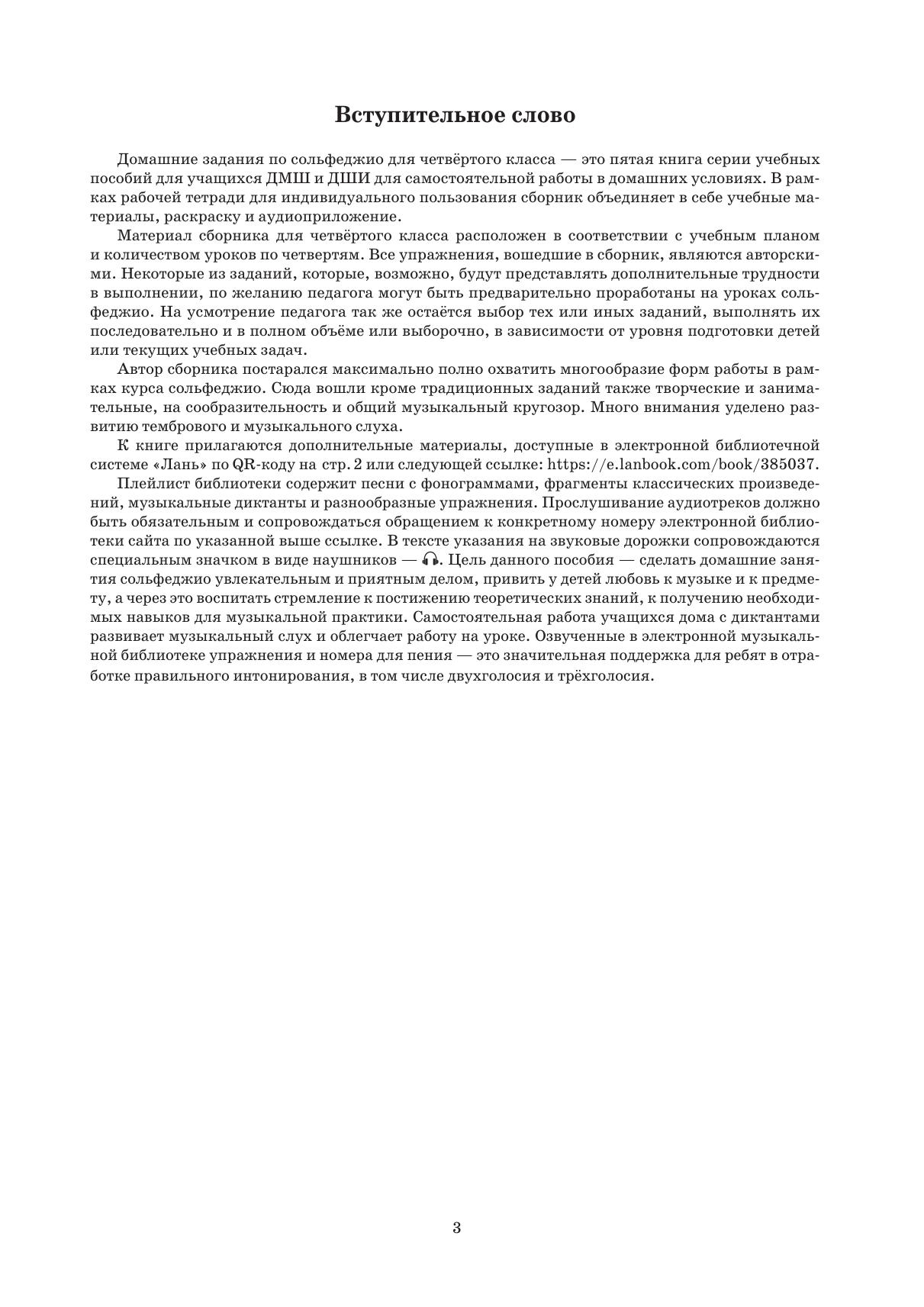 Учебное пособие разработано на основе образовательных программ ДПО для четвёртого класса ДМШ и ДШИ в области музыкального искусства и предназначено для изучения сольфеджио в домашних условиях. В формате рабочей тетради для индивидуального пользования объединены учебные материалы по дисциплине «Сольфеджио», а также включены раскраски и аудиоприложение. Пособие может быть полезным преподавателям и родителям для создания благоприятных условий в обучении дома. Материал представлен в занимательной форме и позволит ребенку в полной мере раскрыть его музыкальные таланты. Пособие является интерактивным и содержит QR-код электронной библиотеки музыки для слушания. The textbook was worked out basing on curriculum of additional vocational education for the first grade of children’s music schools and children’s schools of arts in the field of musical art and is intended for studying solfeggio at home. The individual workbook includes training materials on the “Solfeggio” subject, as well asa audio application and a coloring book. The textbook may be useful for teachers, and parents in creating favorable conditions for children’s practice at home. The material is presented in a funny way and will allow the child to fully develop his/her musical talents. The textbook is interactive and contains an electronic music library QR code for listening.