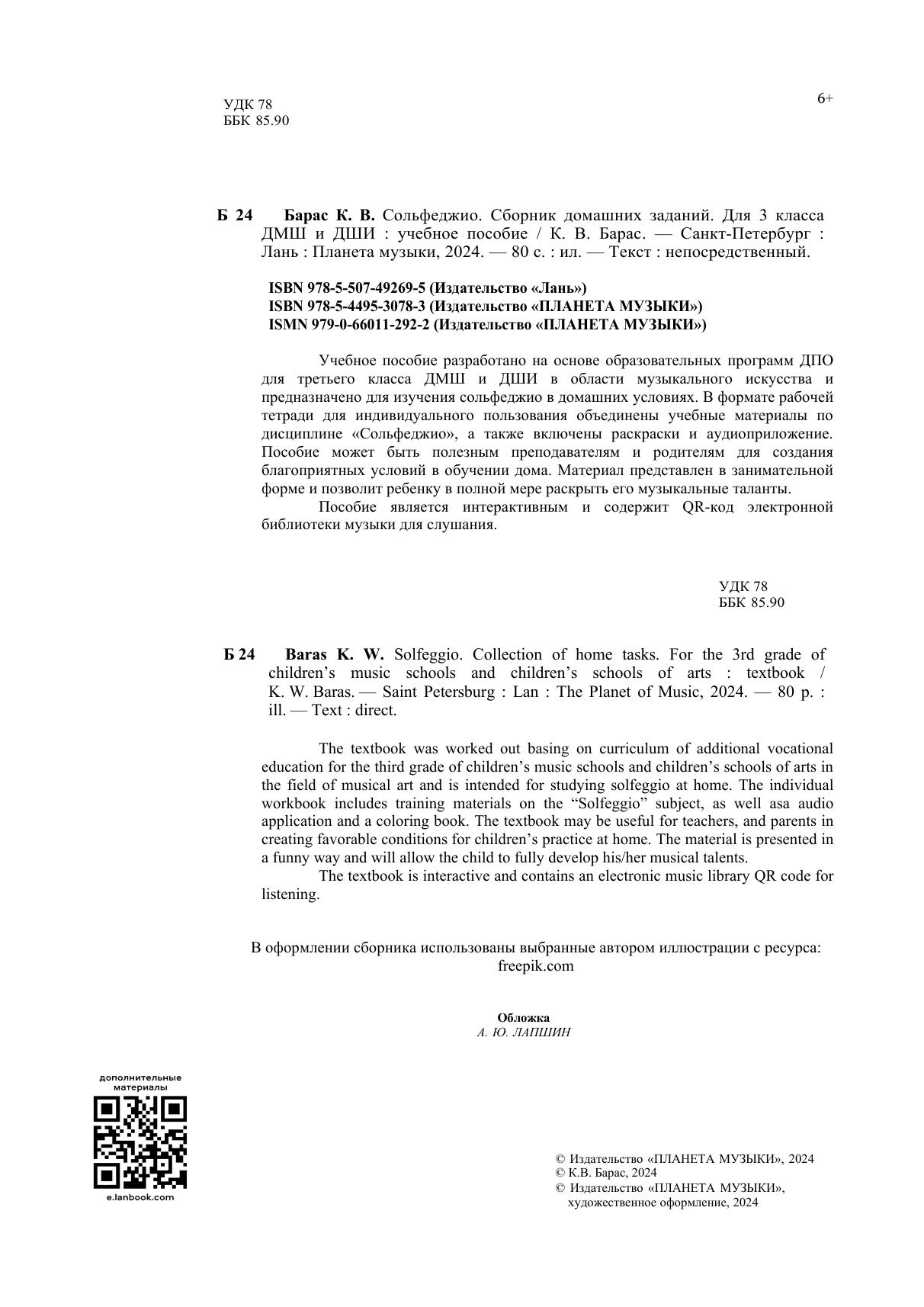 Учебное пособие разработано на основе образовательных программ ДПО для третьего класса ДМШ и ДШИ в области музыкального искусства и предназначено для изучения сольфеджио в домашних условиях. В формате рабочей тетради для индивидуального пользования объединены учебные материалы по дисциплине «Сольфеджио», а также включены раскраски и аудиоприложение. Пособие может быть полезным преподавателям и родителям для создания благоприятных условий в обучении дома. Материал представлен в занимательной форме и позволит ребенку в полной мере раскрыть его музыкальные таланты. Пособие является интерактивным и содержит QR-код электронной библиотеки музыки для слушания. The textbook was worked out basing on curriculum of additional vocational education for the third grade of children’s music schools and children’s schools of arts in the field of musical art and is intended for studying solfeggio at home. The individual workbook includes training materials on the “Solfeggio” subject, as well asa audio application and a coloring book. The textbook may be useful for teachers, and parents in creating favorable conditions for children’s practice at home. The material is presented in a funny way and will allow the child to fully develop his/her musical talents. The textbook is interactive and contains an electronic music library QR code for listening.