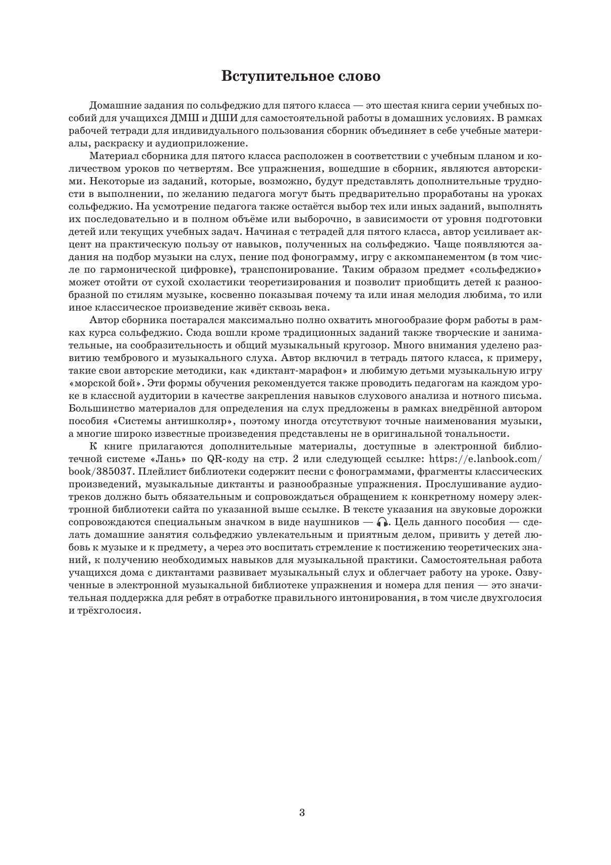 Учебное пособие разработано на основе образовательных программ ДПО для пятого класса ДМШ и ДШИ в области музыкального искусства и предназначено для изучения сольфеджио в домашних условиях. В формате рабочей тетради для индивидуального пользования объединены учебные материалы по дисциплине «Сольфеджио», а также включены раскраски и аудиоприложение. Пособие может быть полезным преподавателям и родителям для создания благоприятных условий в обучении дома. Материал представлен в занимательной форме и позволит ребенку в полной мере раскрыть его музыкальные таланты. Пособие является интерактивным и содержит QR-код электронной библиотеки музыки для слушания. The textbook was worked out basing on curriculum of additional vocational education for the fifth grade of children’s music schools and children’s schools of arts in the field of musical art and is intended for studying solfeggio at home. The individual workbook includes training materials on the “Solfeggio” subject, as well as an audio application and a coloring book. The textbook may be useful for teachers, and parents in creating favorable conditions for children’s practice at home. The material is presented in a funny way and will allow the child to fully develop his/her musical talents. The textbook is interactive and contains an electronic music library QR code for listening.